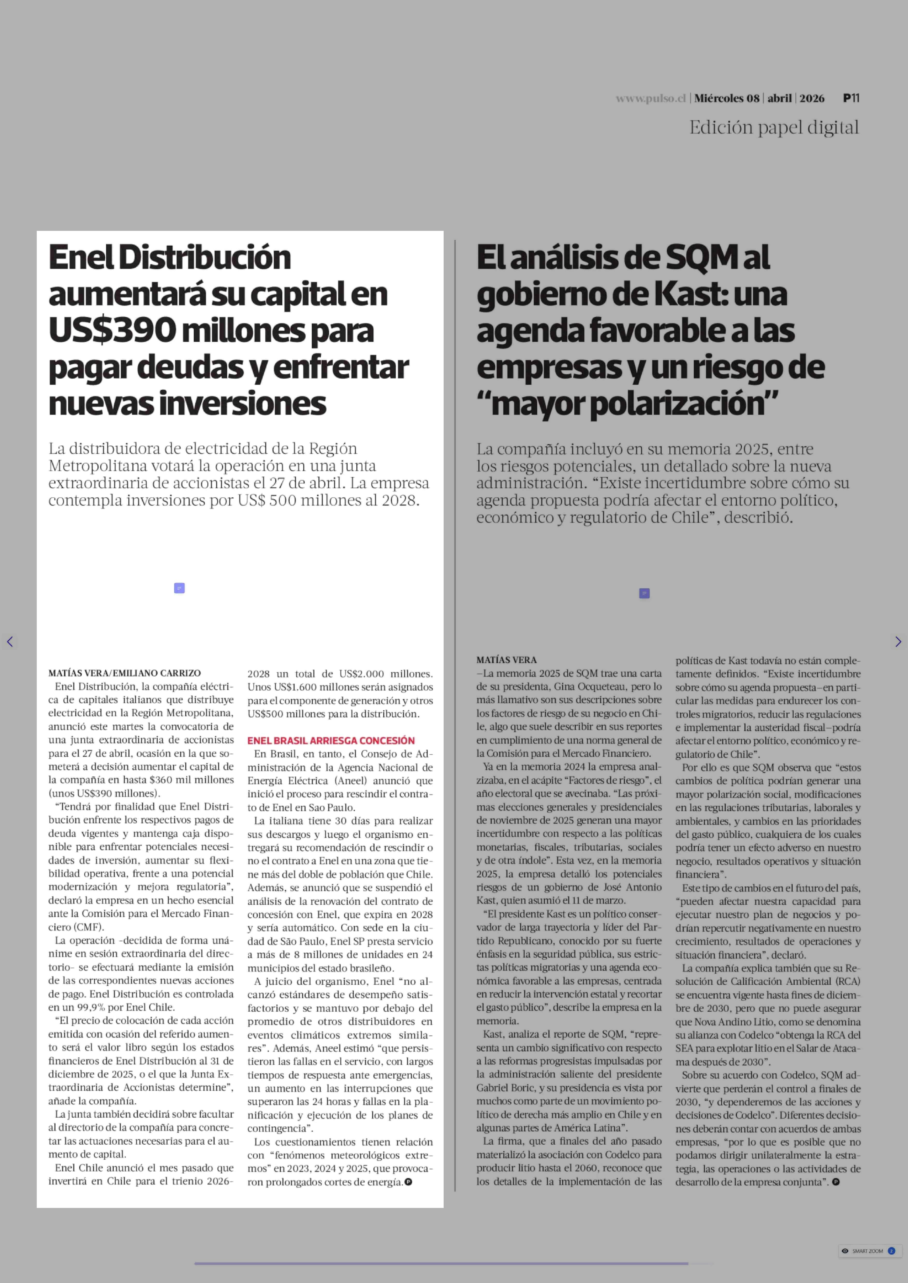 Título: Enel Distribución aumentará su capital en US$390 millones para pagar deudas y enfrentar nuevas inversiones