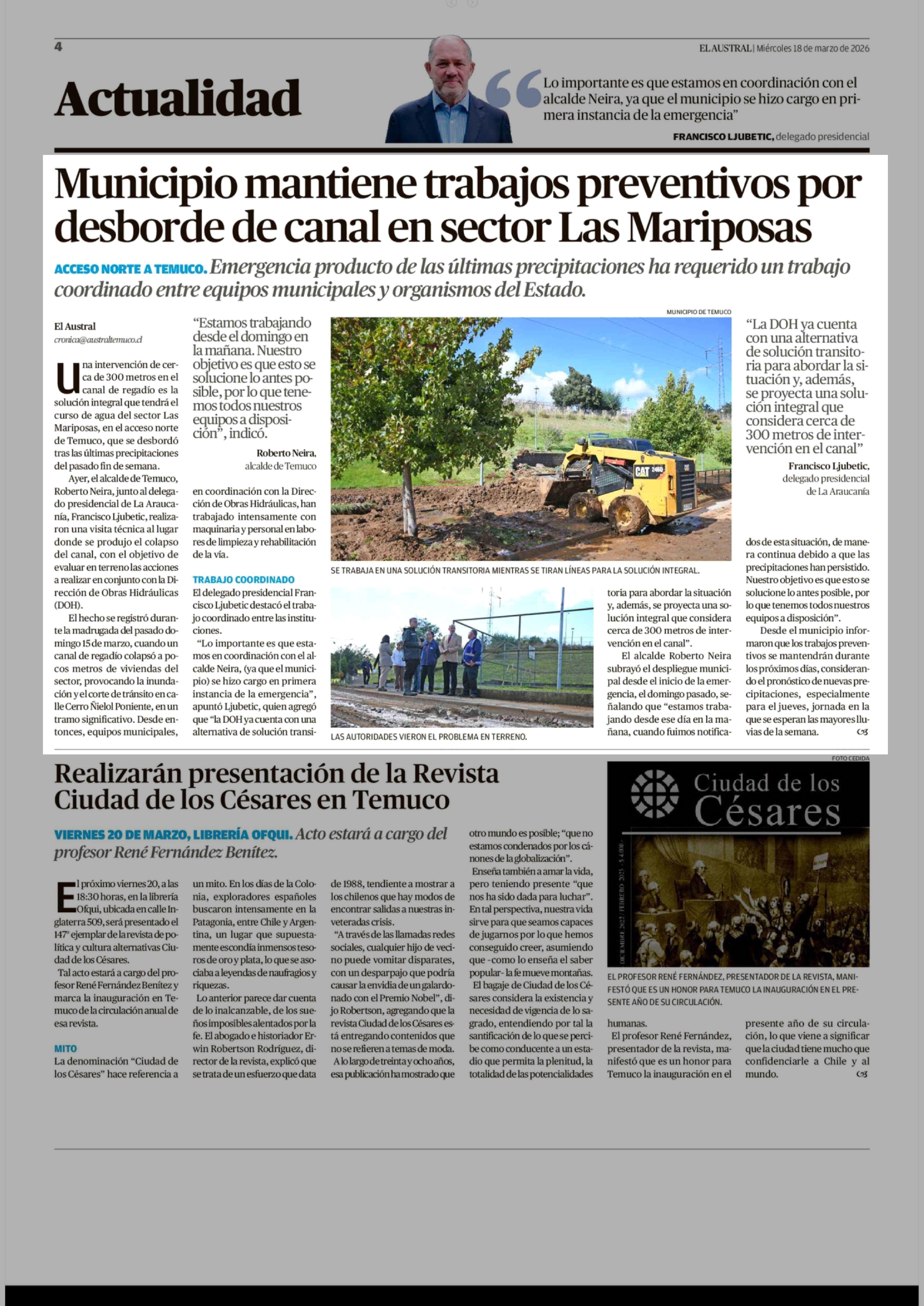 Municipio mantiene trabajos preventivos por desborde de canal en sector Las Mariposas 18-03-2026 El Austral de la Araucanía |