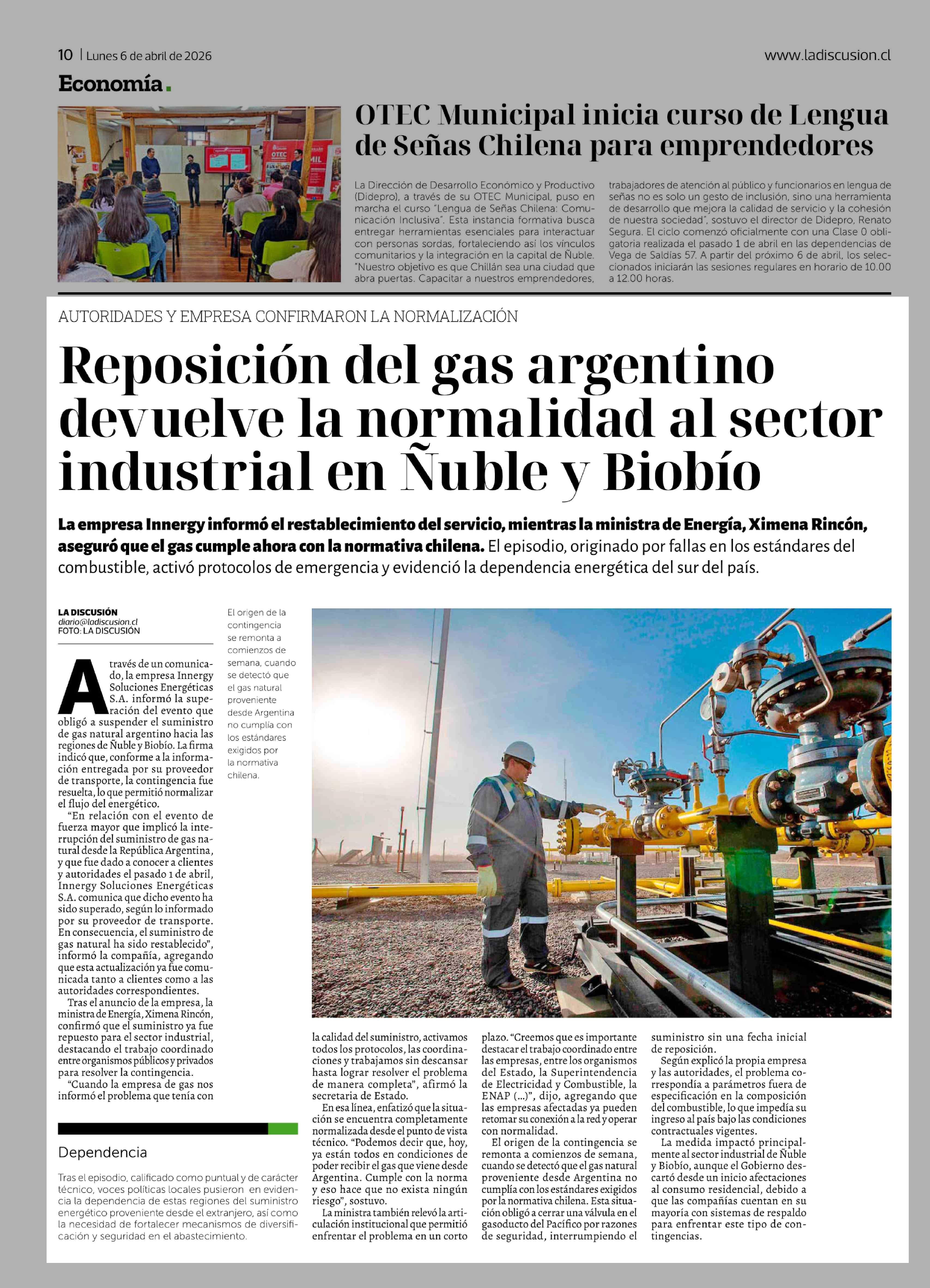 Reposición del gas argentino devuelve la normalidad al sector industrial en Nuble y Biobío 06-04-2026 La Discusión |