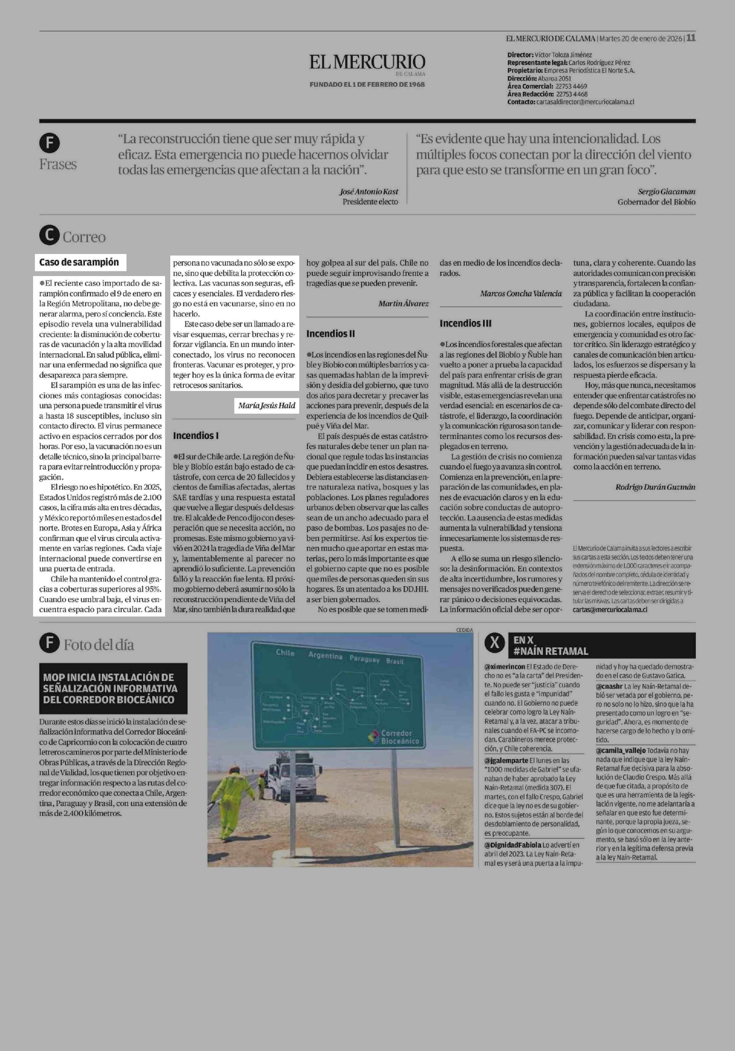Caso de sarampión 20-01-2026 El Mercurio de Calama |