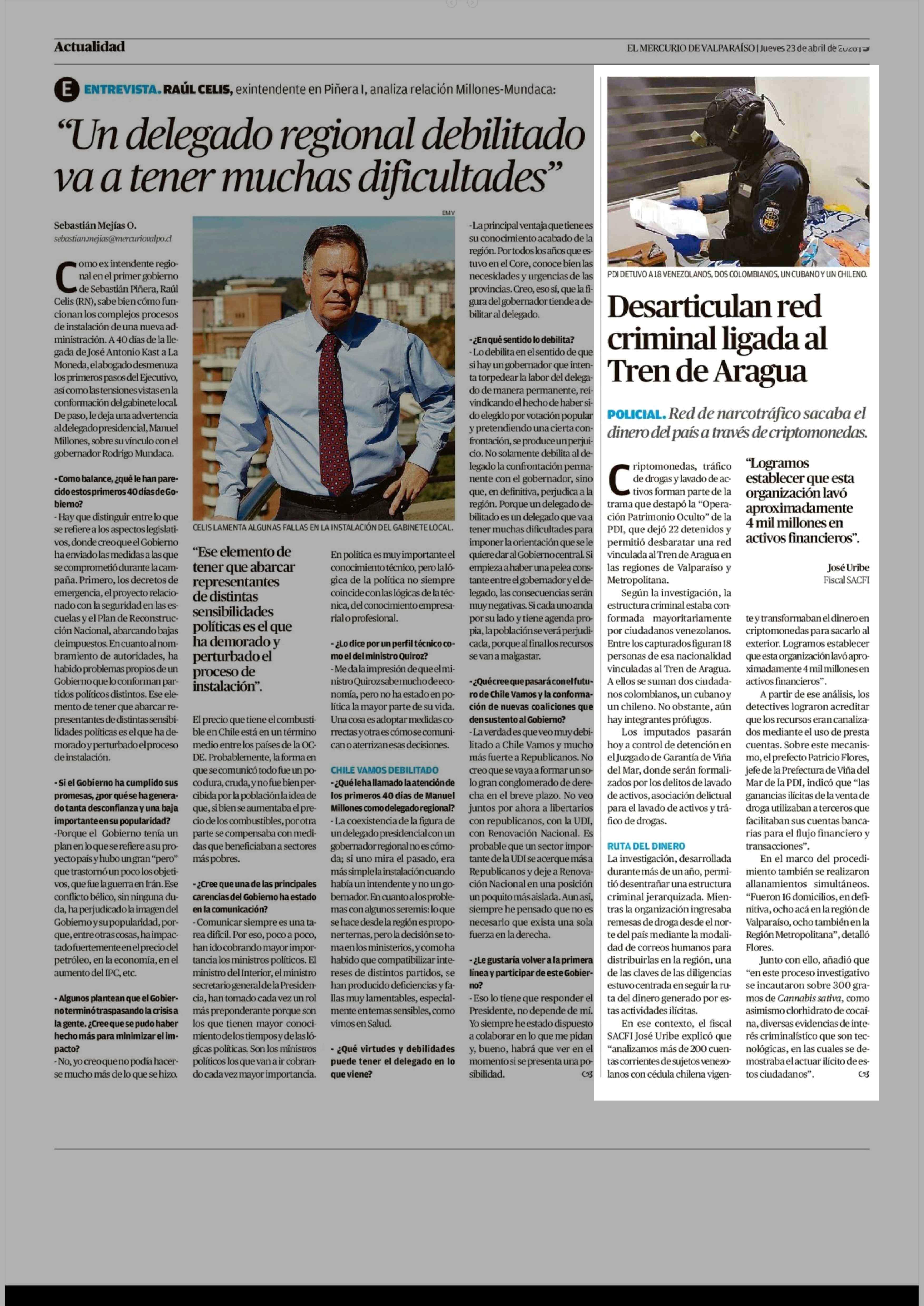 Desarticulan red criminal ligada al Tren de Aragua 23-04-2026 El Mercurio de Valparaíso |