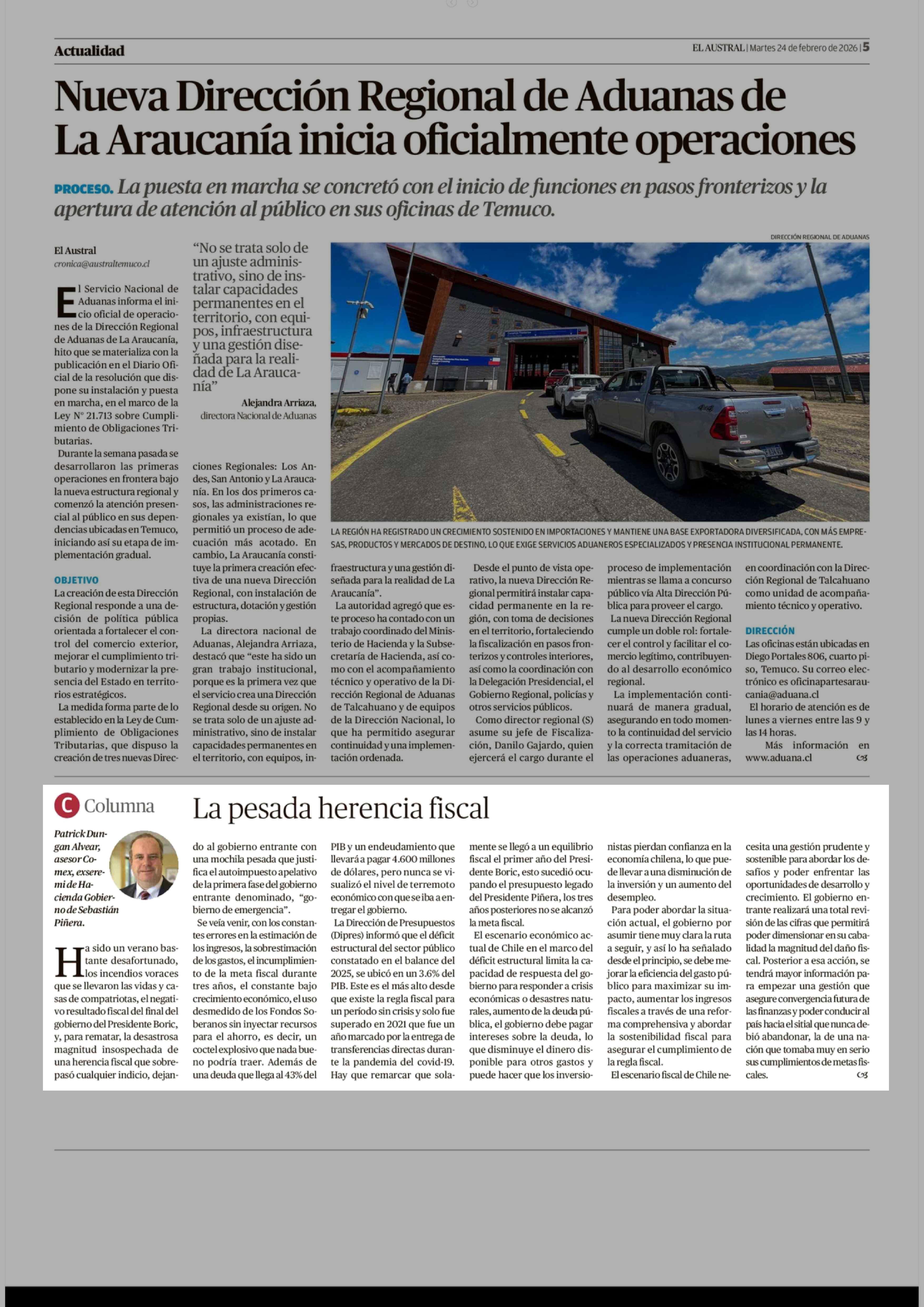 Columnas de Opinión: La pesada herencia fiscal 24-02-2026 El Austral de la Araucanía |