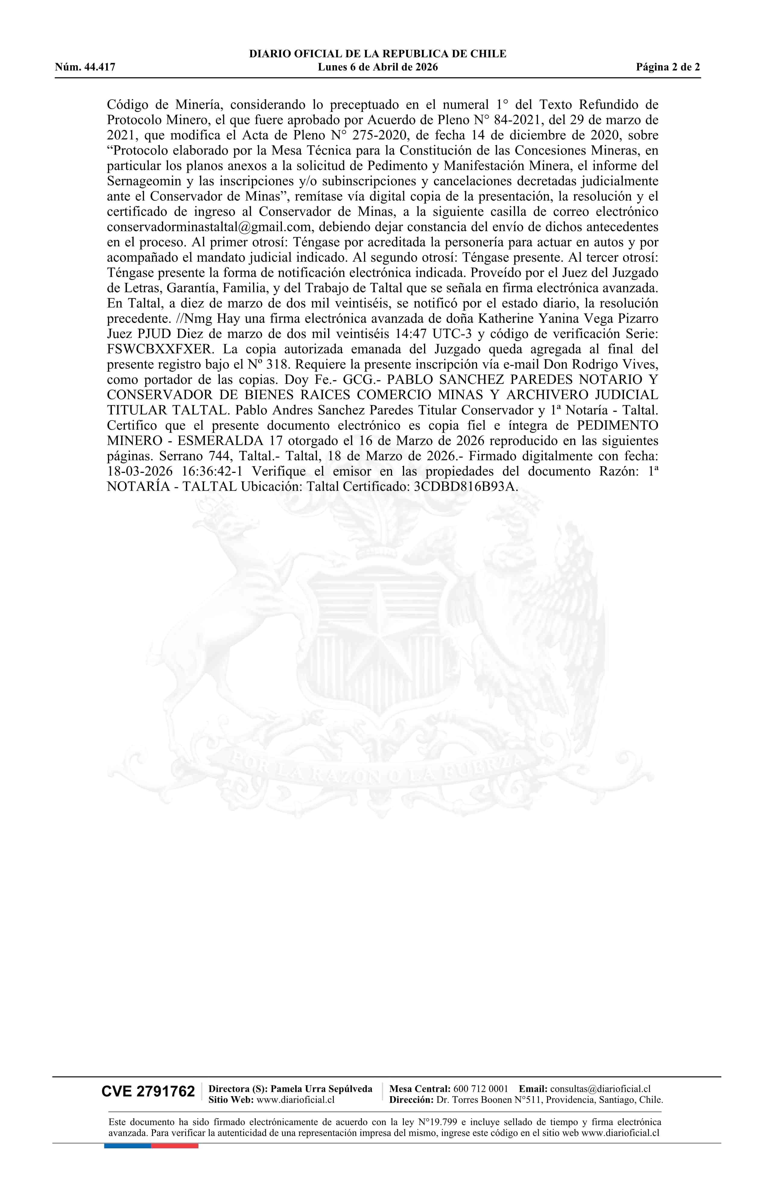 Fuente: DIARIO OFICIAL CHILE - BOLETÍN OFICIAL DE MINERÍA (DIARIO OFICIAL CHILE – BOM – PEDIMENTOS MINEROS) Página(s): 17-18