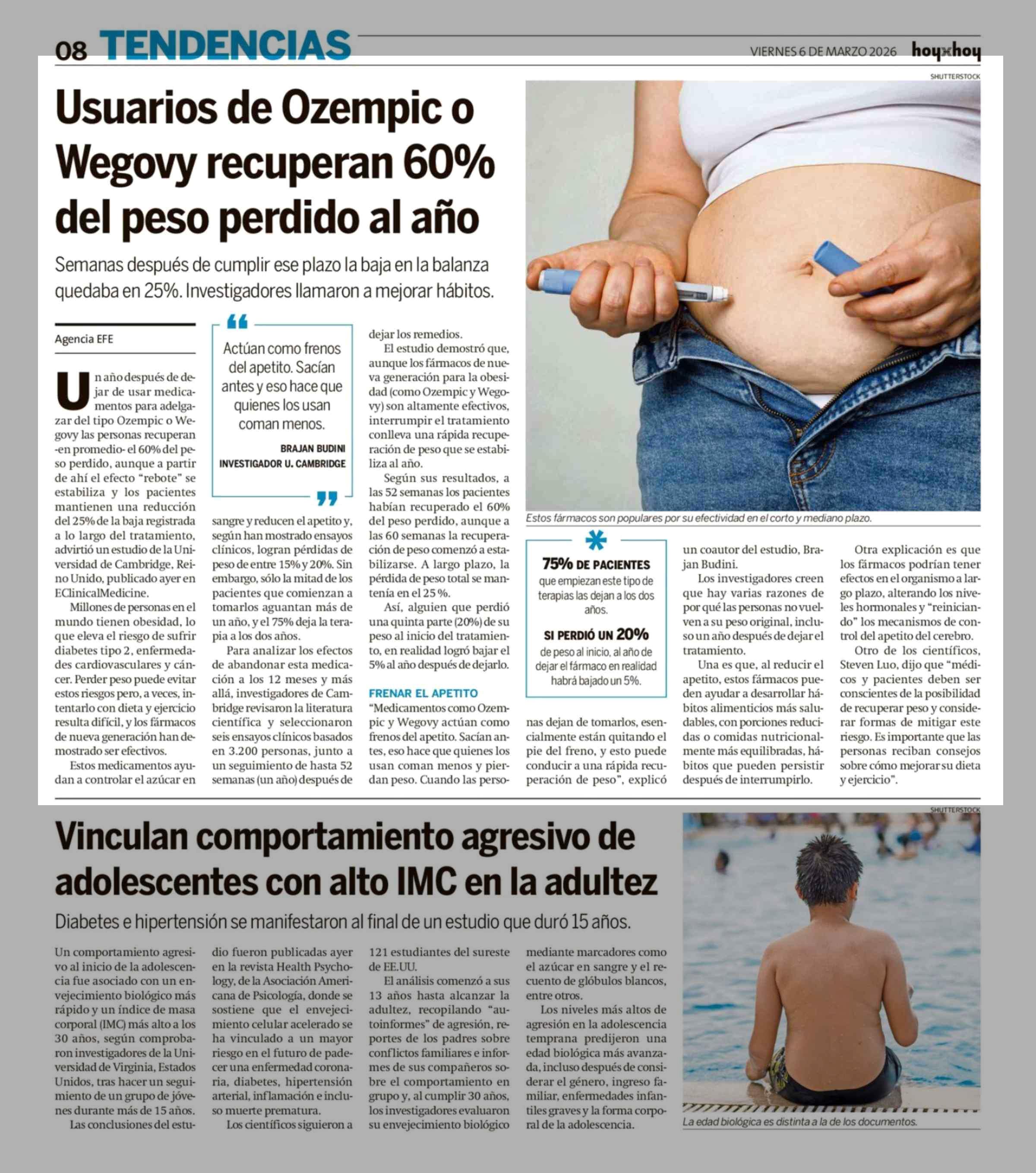 Título: Usuarios de Ozempic o Wegovy recuperan 60% del peso perdido al año