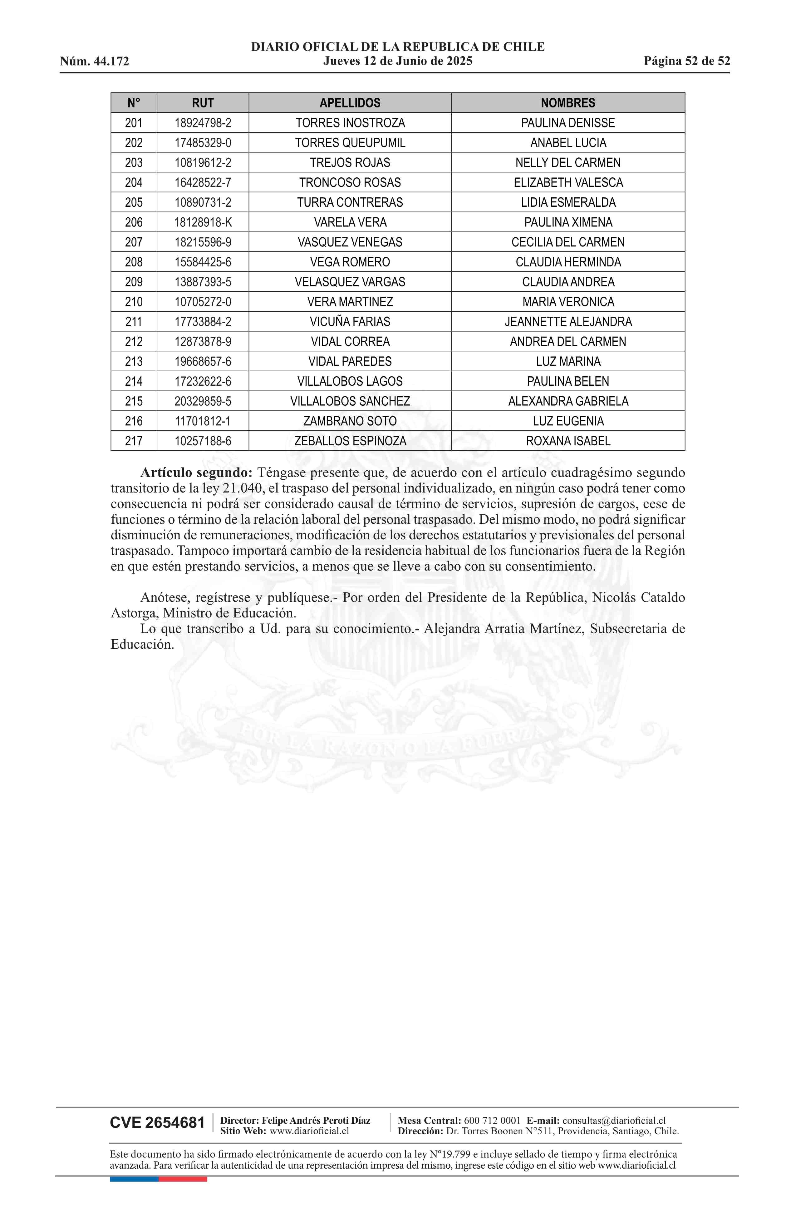 | Título: | Decreto exento número 381, de 2025.- Individualiza a profesionales de la educación y asistentes de la educación que se desempeñan en los establecimientos educacionales de dependencia de las municipalidades de Conchalí y Quilicura, traspasados al Servicio Local de Educación Pública Los Libertadores, |