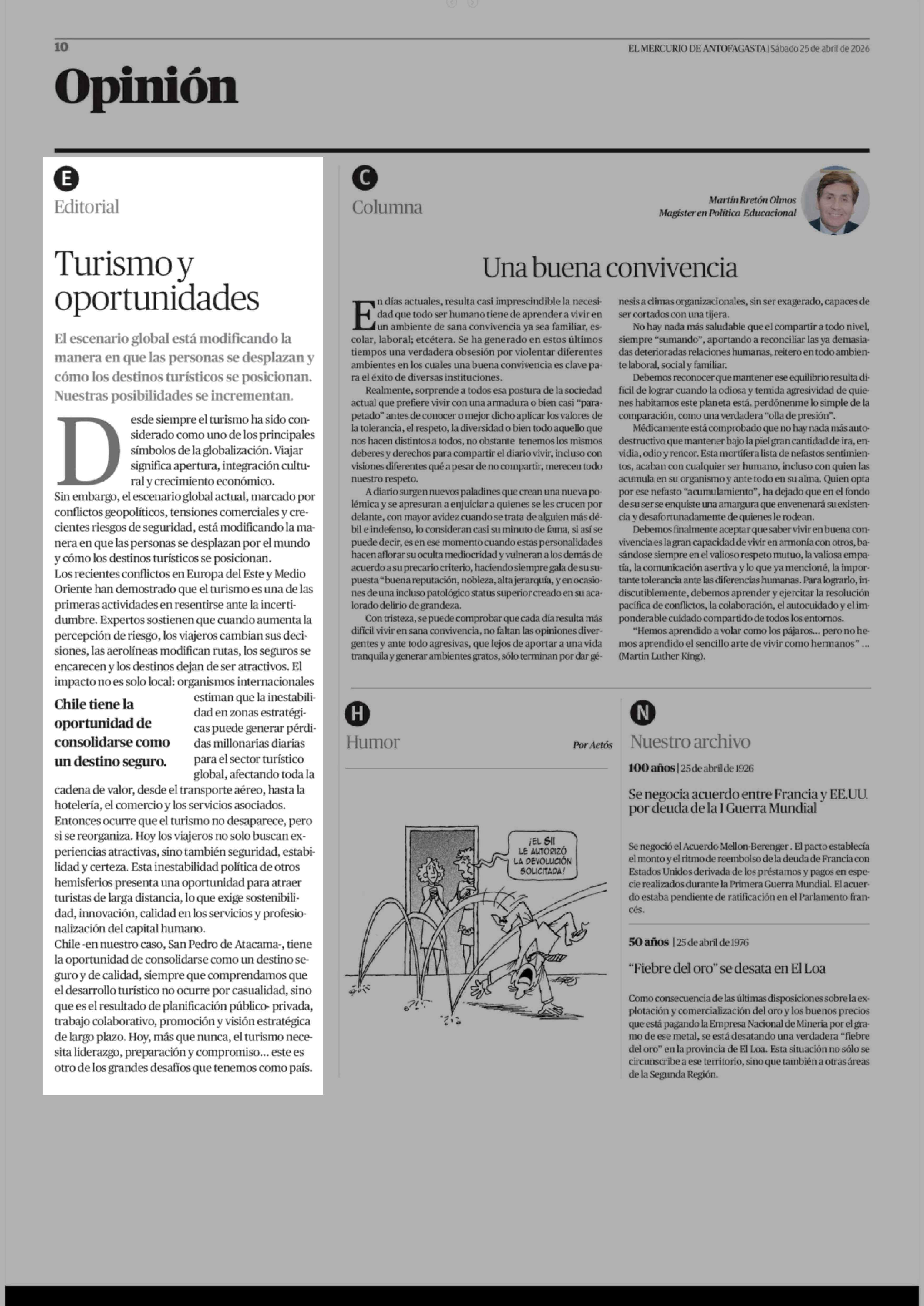 Editorial: Turismo y oportunidades 25-04-2026 El Mercurio de Antofagasta |