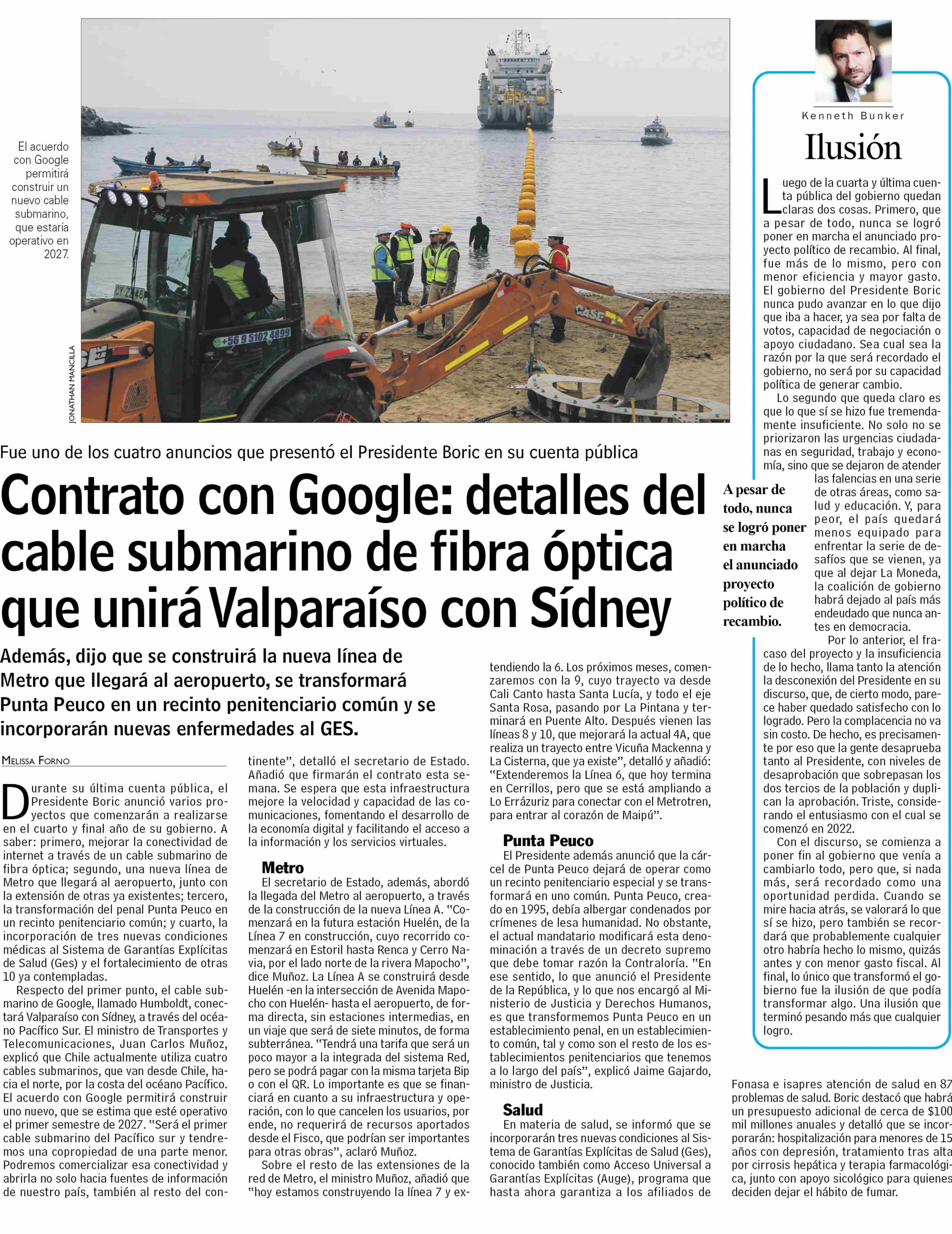Contrato con Google: detalles de cable submarino de fibra óptica que unirá Valparaíso con Sidney 02-06-2025 Las Últimas Noticias |