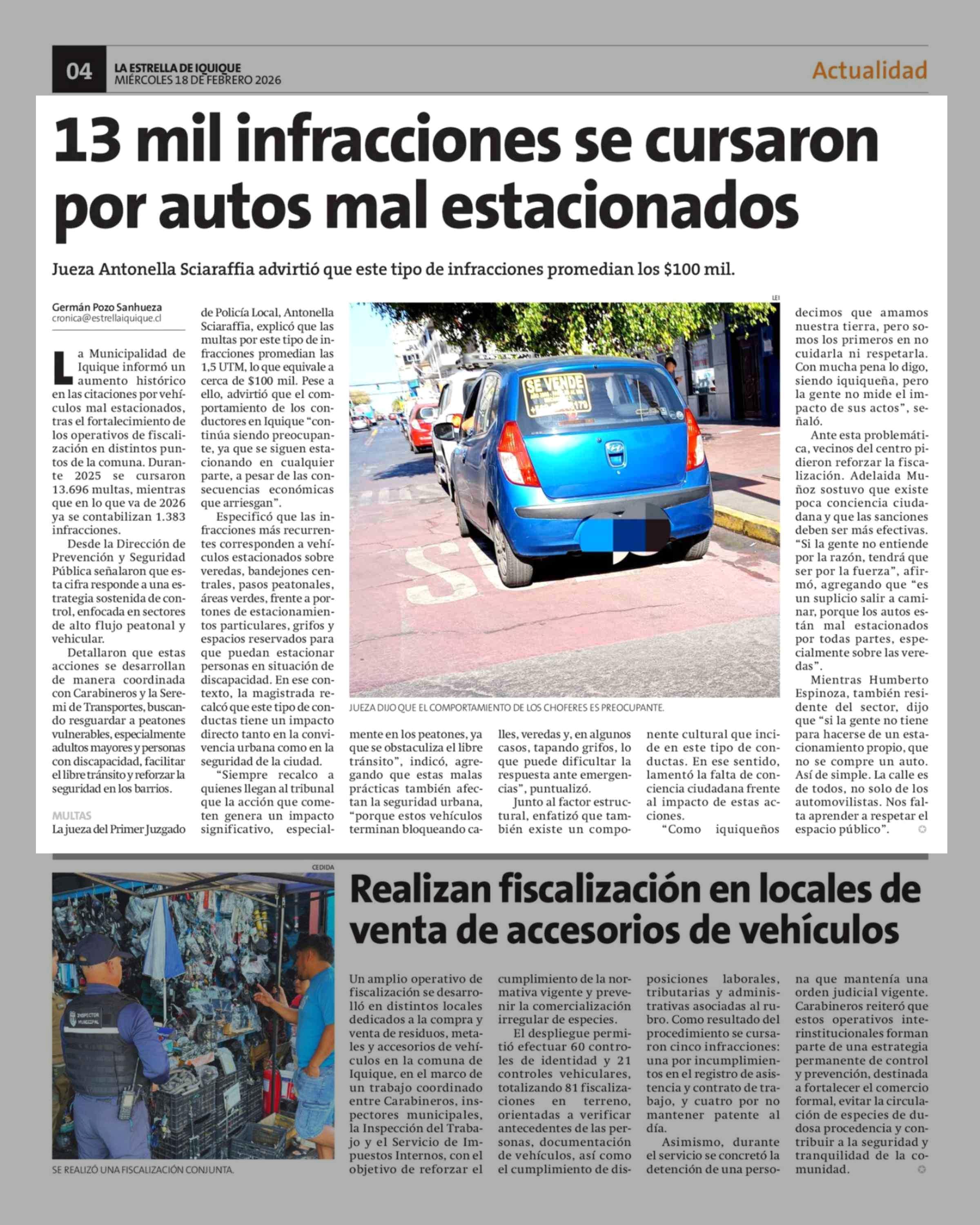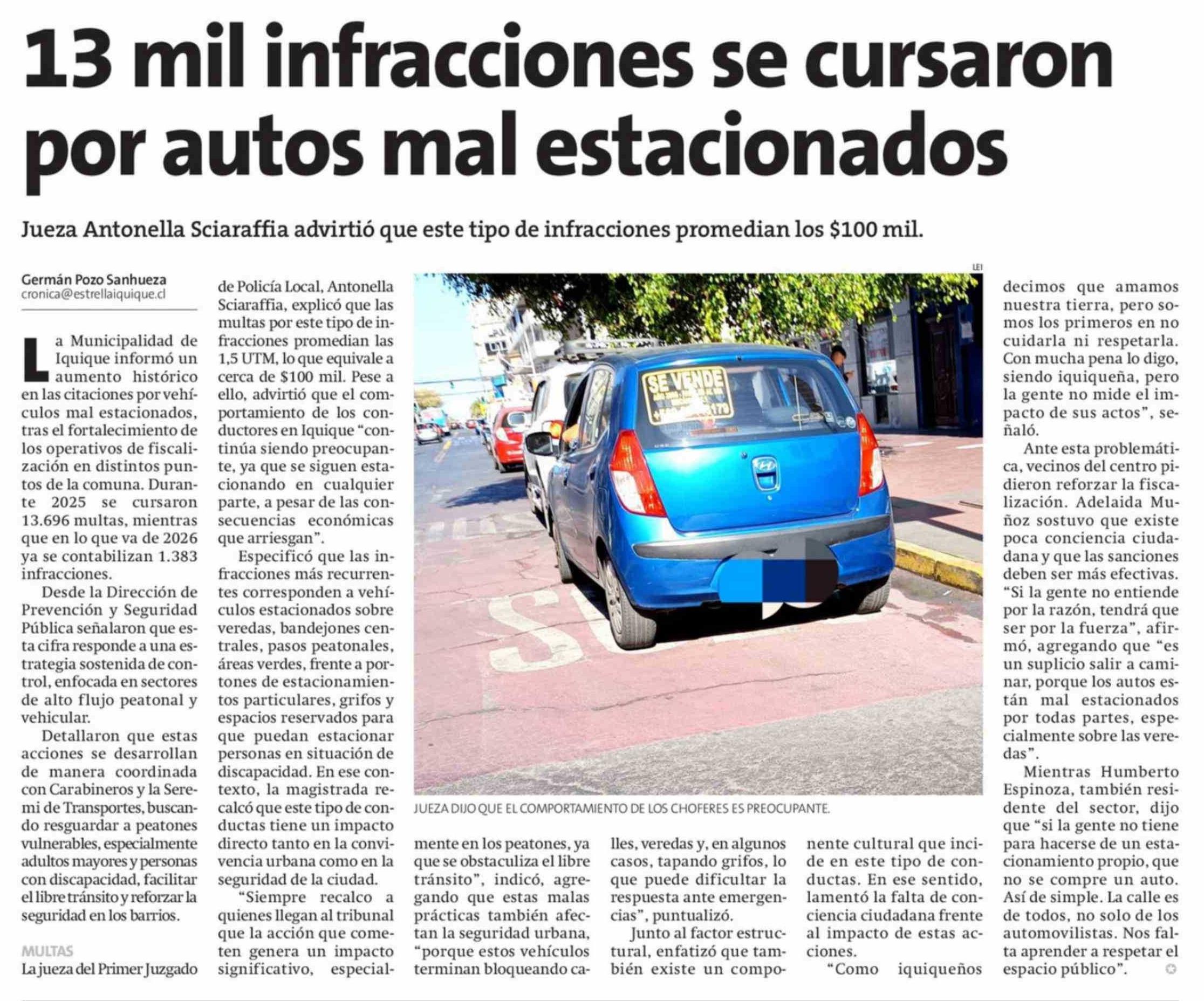 13 Mil infracciones se cursaron por autos mal estacionados 18-02-2026 La Estrella de Iquique |
