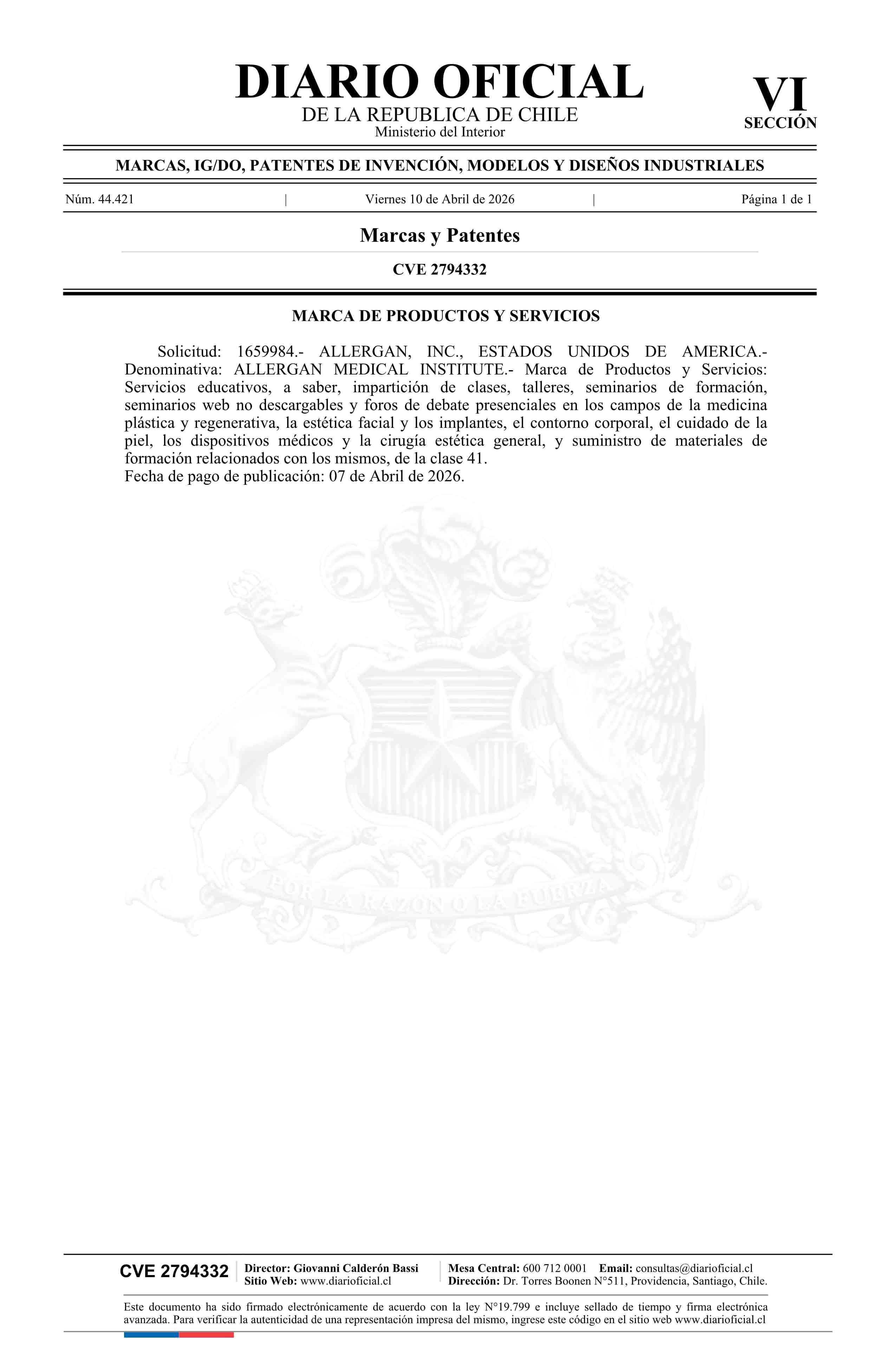 Solicitud número 1659984.- ALLERGAN MEDICAL INSTITUTE 10-04-2026 Diario Oficial Edición Electrónica |