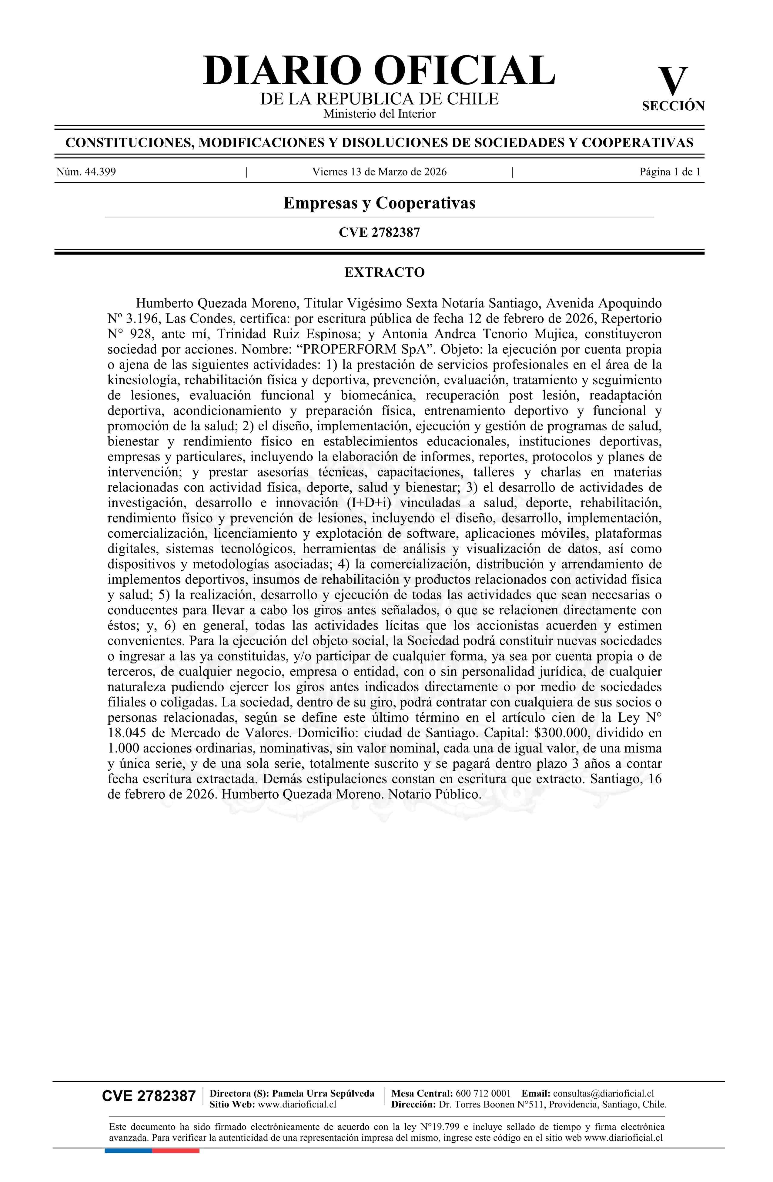 PROPERFORM SpA 13-03-2026 Diario Oficial Edición Electrónica |