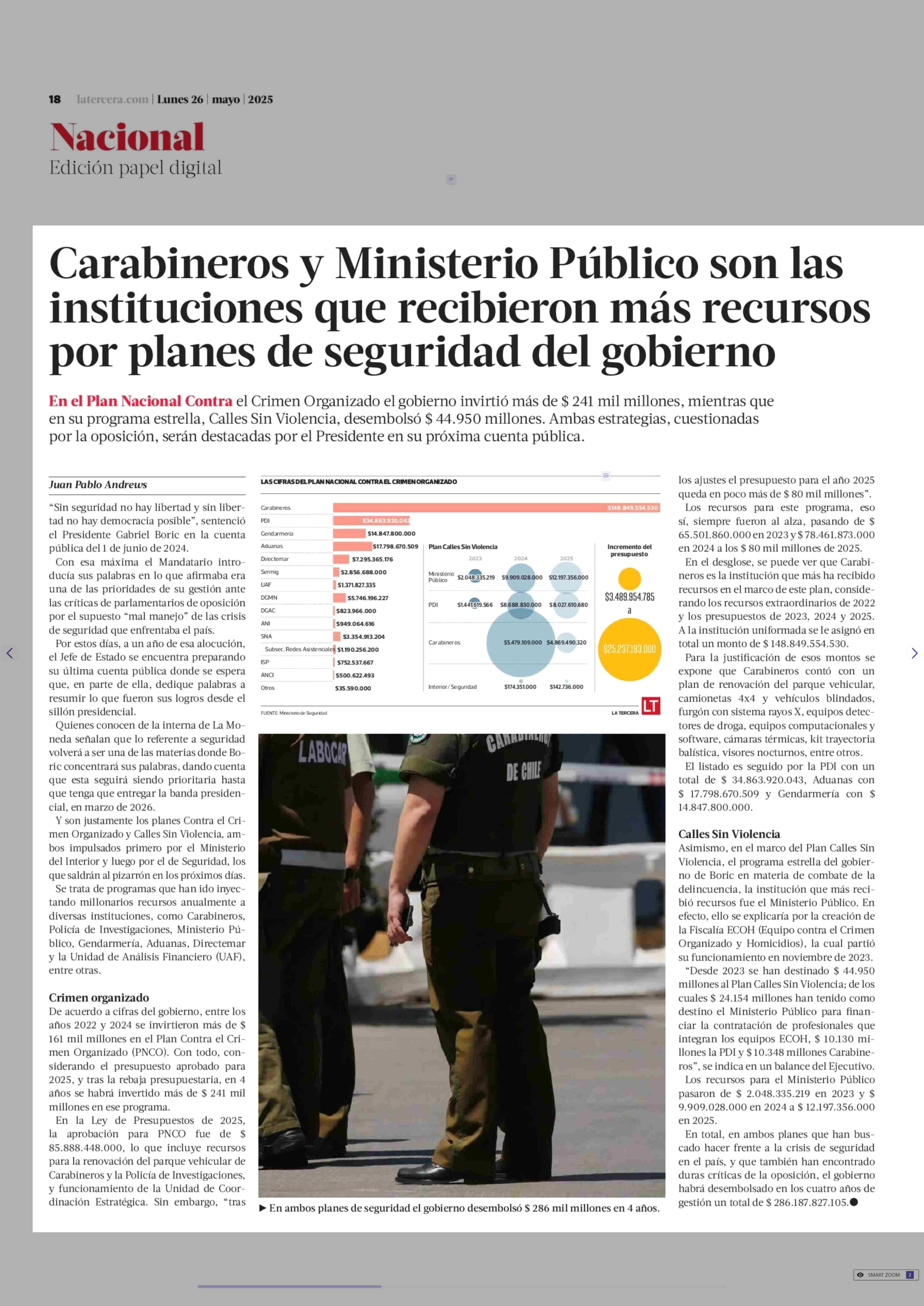 Carabineros y Ministerio Público son las instituciones que recibieron más recursos por planes de seguridad del gobierno 26-05-2025 La Tercera |