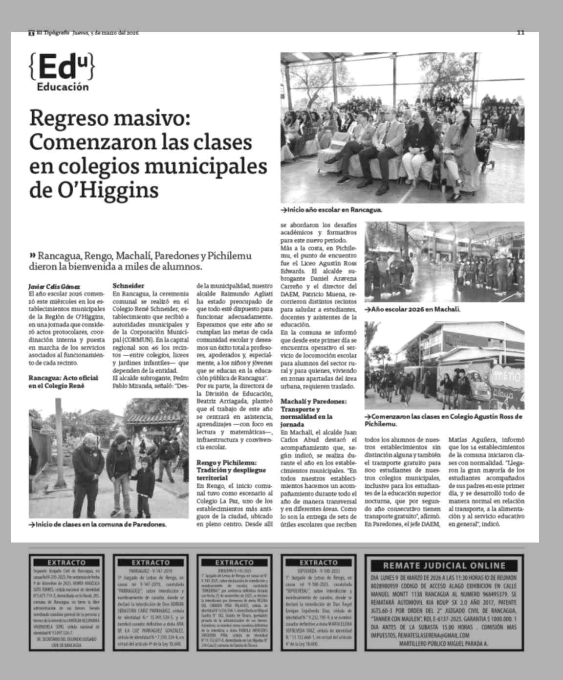 Regreso masivo: Comenzaron las clases en colegios municipales de O'Higgins 05-03-2026 El Tipógrafo |