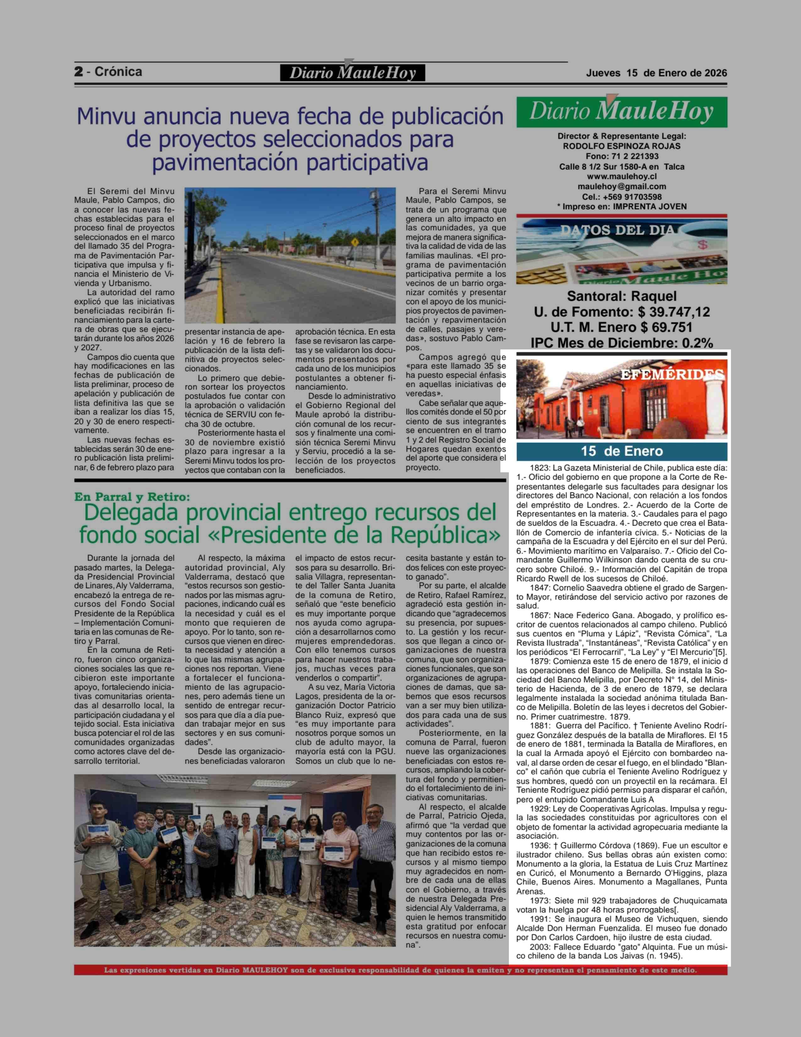 EFEMÉRIDES 15-01-2026 Maule Hoy |