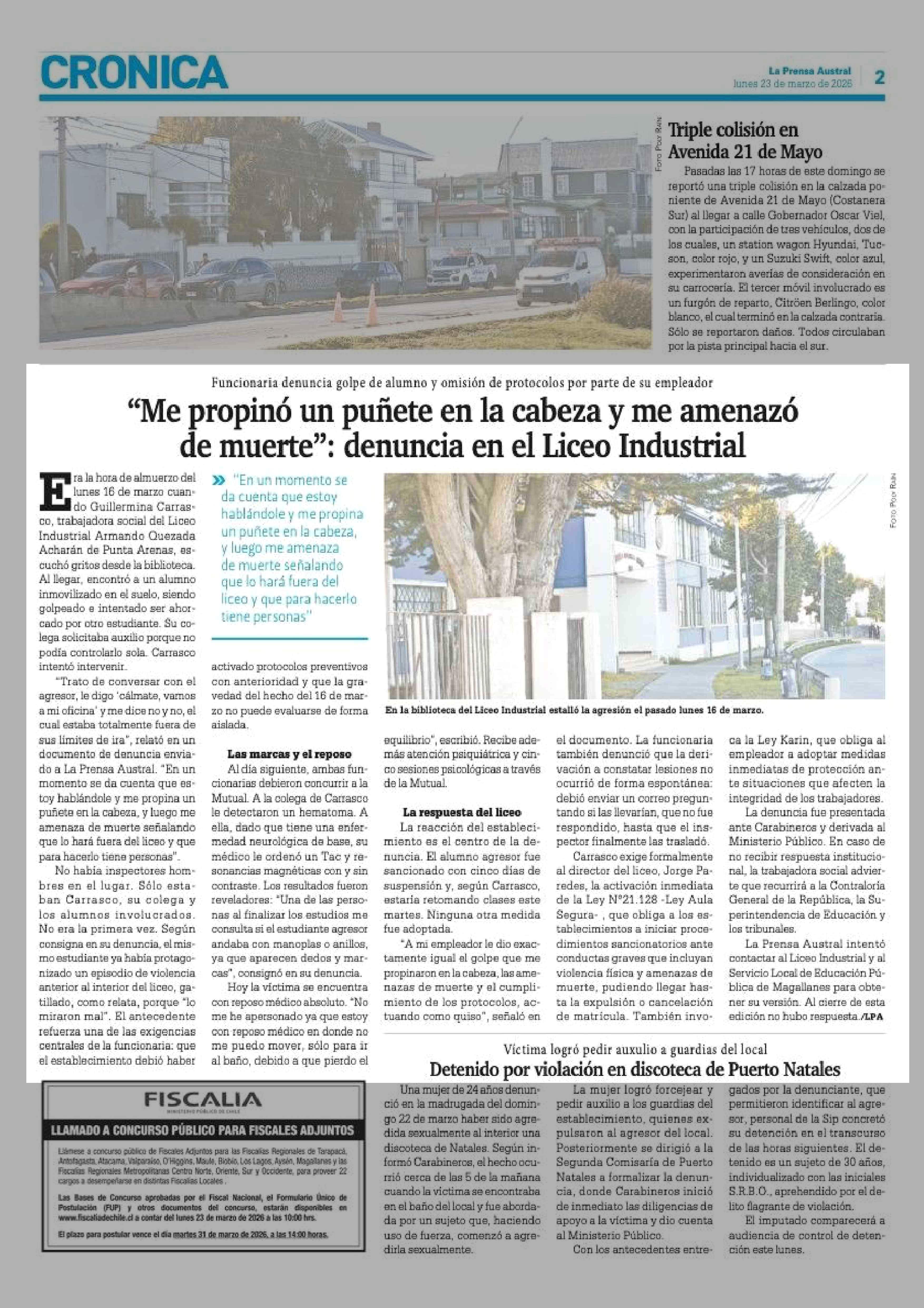 "Me propinó un puñete en la cabeza y me amenazó de muerte": denuncia en el Liceo Industrial 23-03-2026 La Prensa Austral |