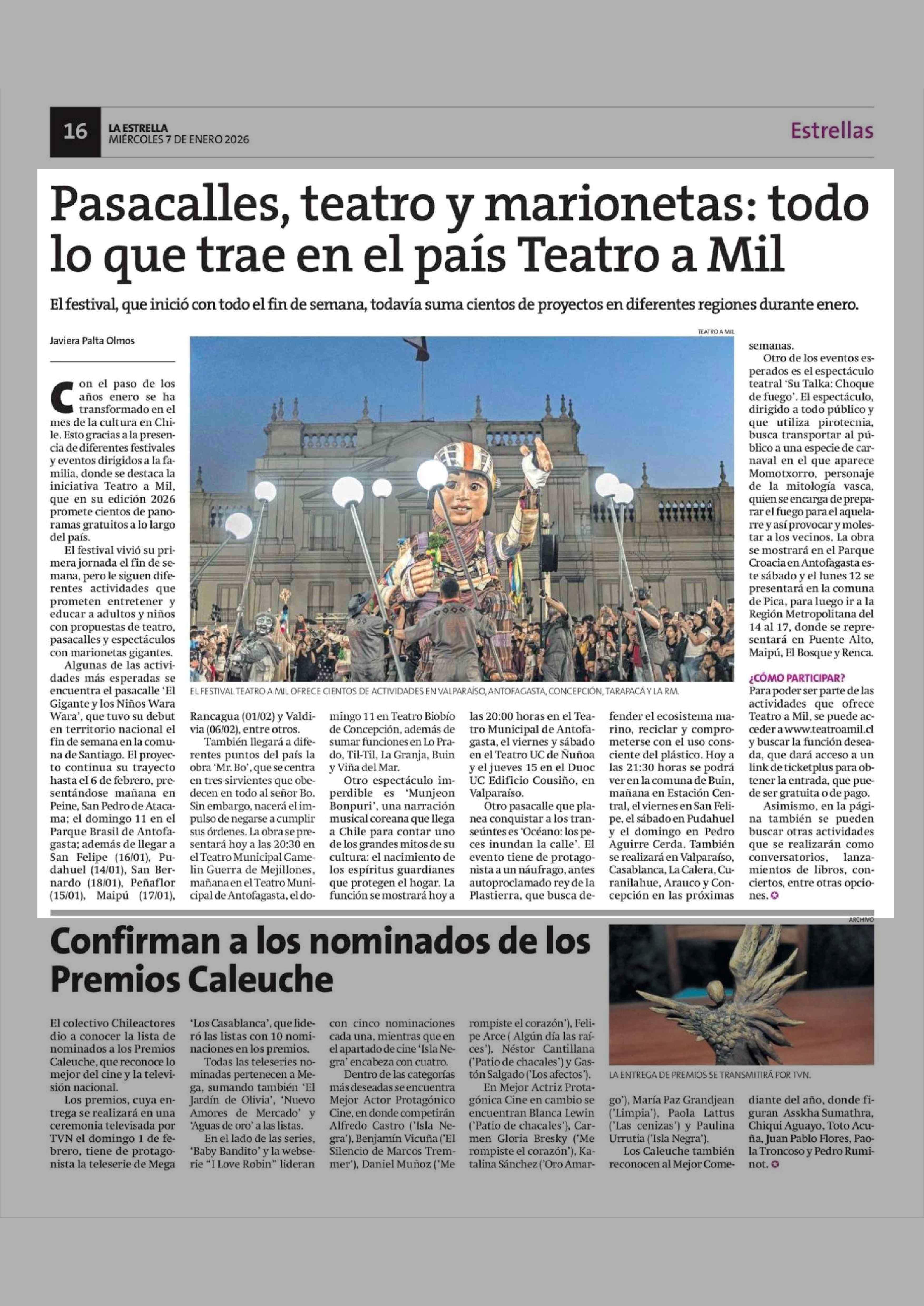 Pasacalles, teatro y marionetas: todo lo que trae en el país Teatro a Mil 07-01-2026 La Estrella de Concepción |