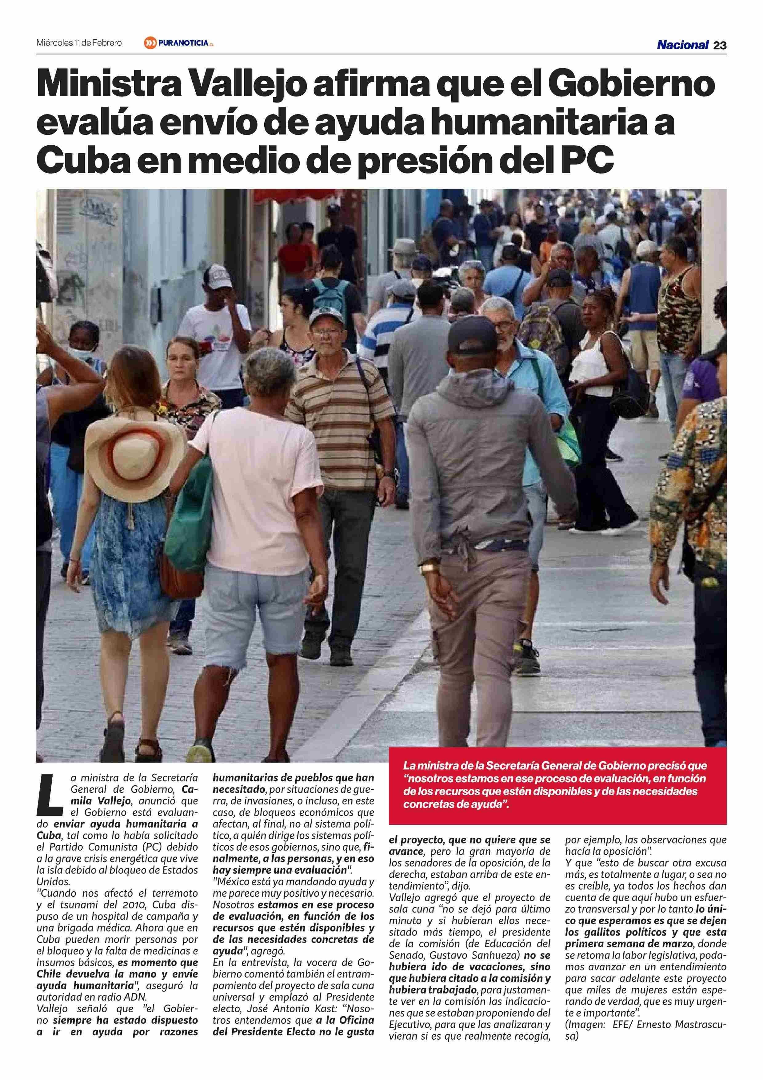 Ministra Vallejo afirma que el Gobierno evalúa envío de ayuda humanitaria a Cuba en medio de presión del PC 11-02-2026 Puranoticia.cl |