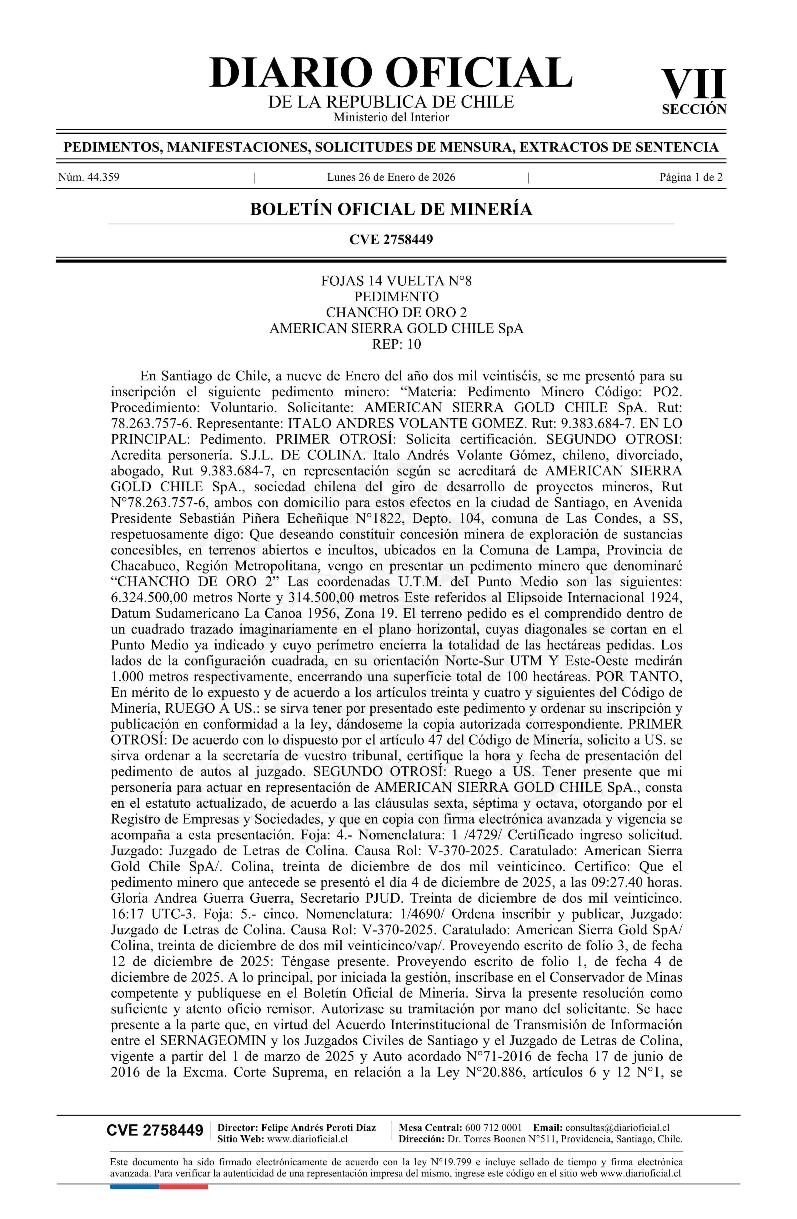 Título: CHANCHO DE ORO 2 / American Sierra Gold Chile SpA