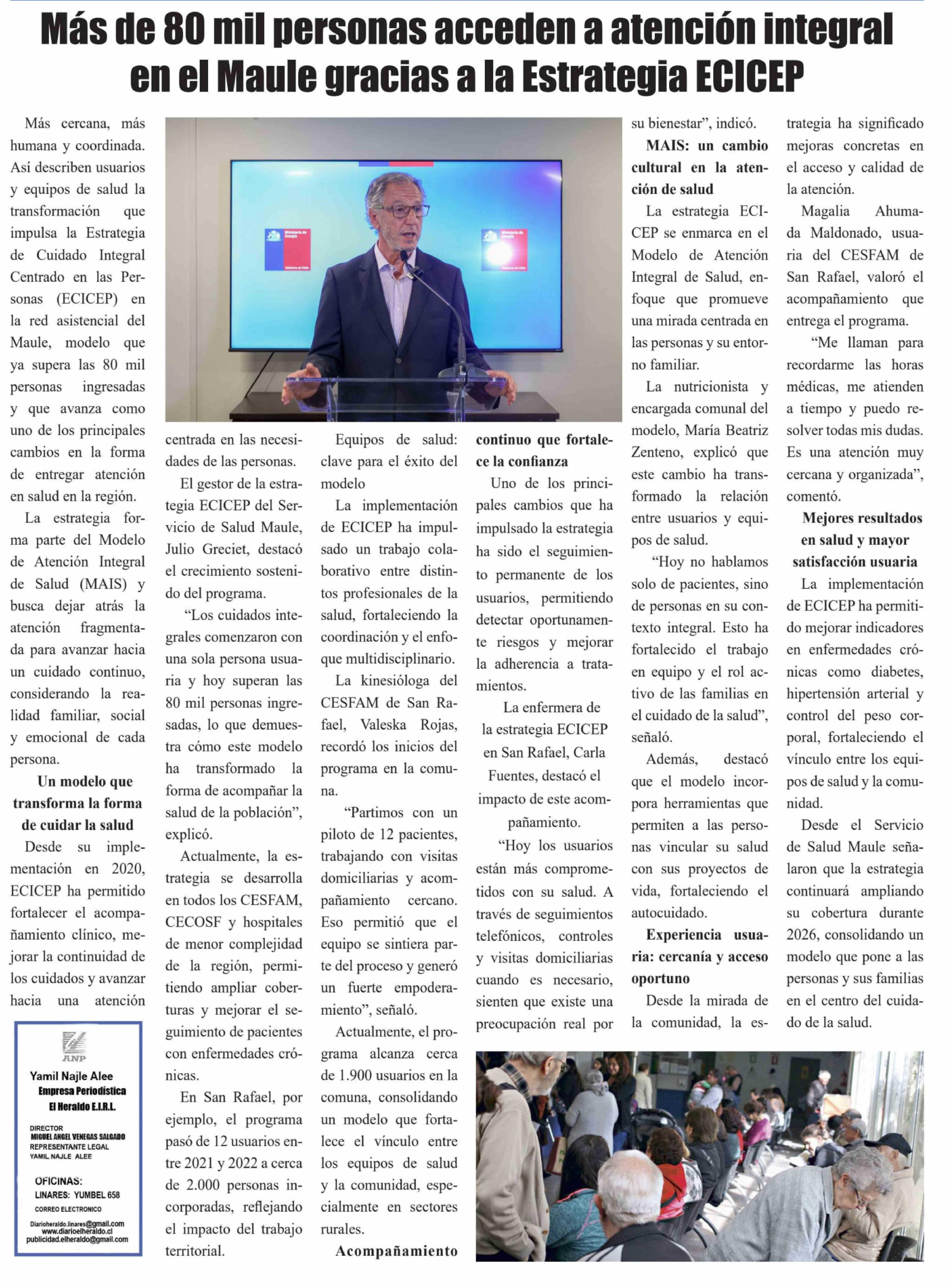 Más de 80 mil personas acceden a atención integral en el Maule gracias a la Estrategia ECICEP 11-02-2026 El Heraldo |