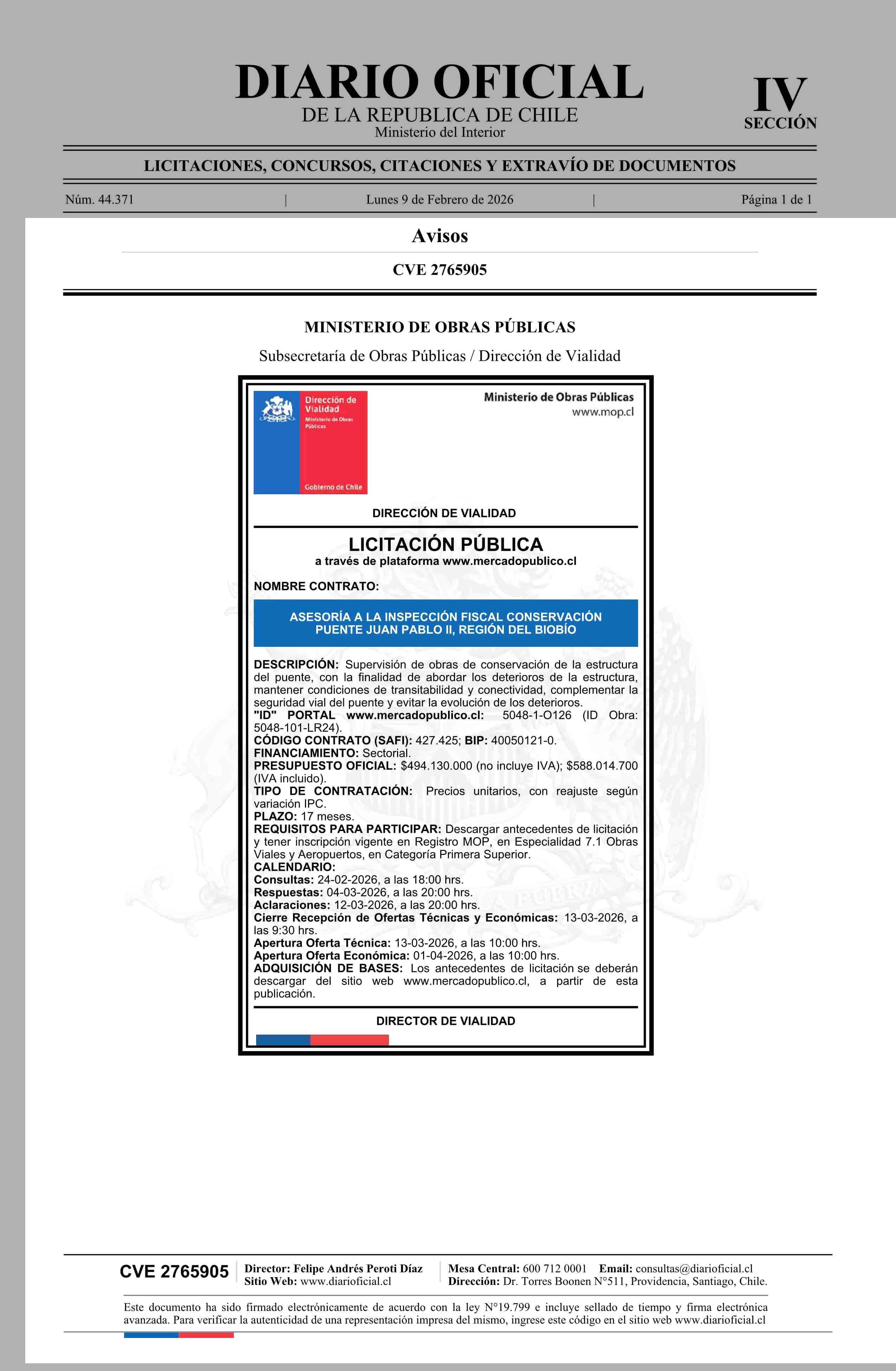 AVISO LICITACIONES: DIRECCIÓN DE VIALIDAD 09-02-2026 Diario Oficial Edición Electrónica |