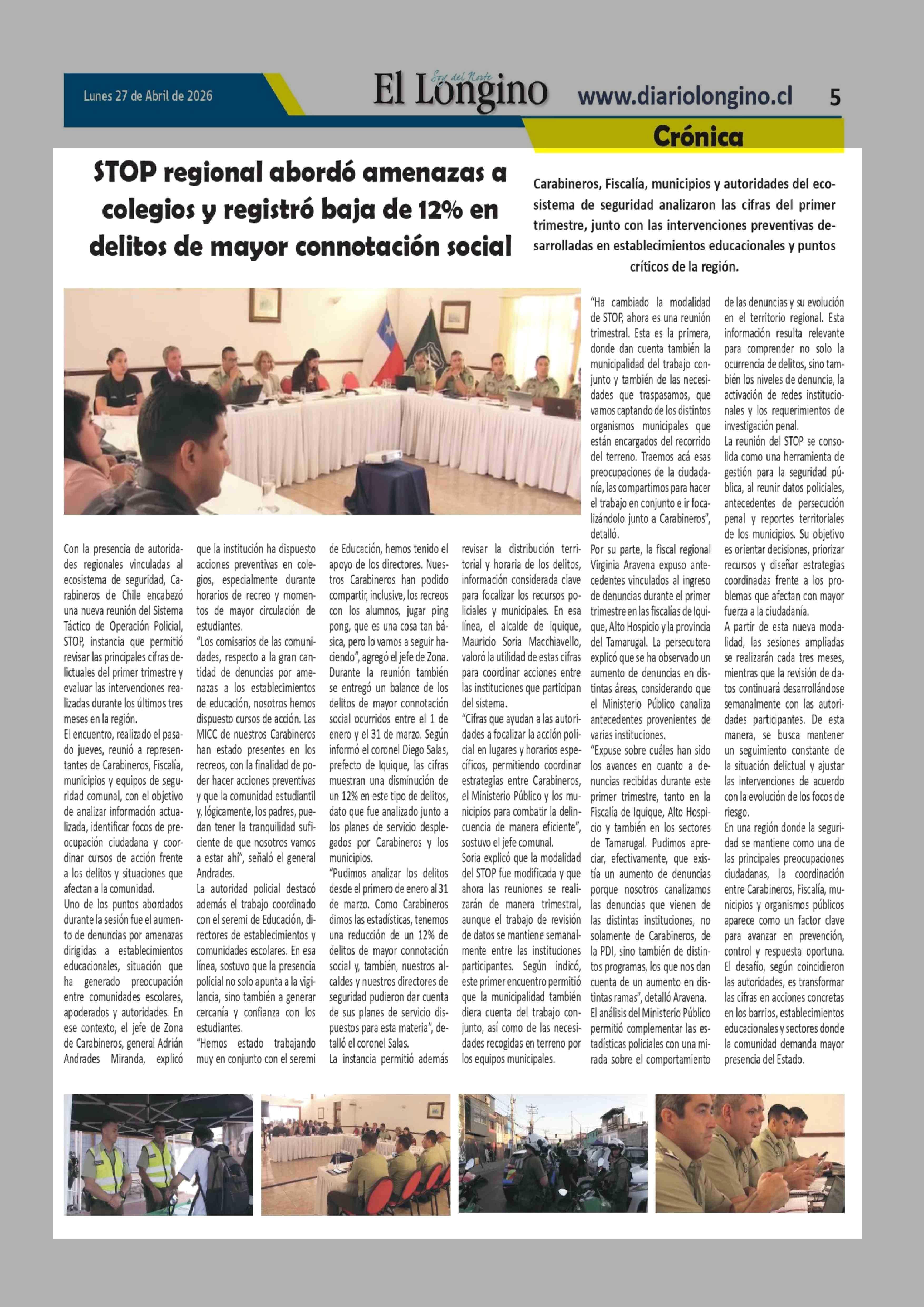 STOP regional abordó amenazas a colegios y registró baja de 12% en delitos de mayor connotación social 27-04-2026 El Longino |