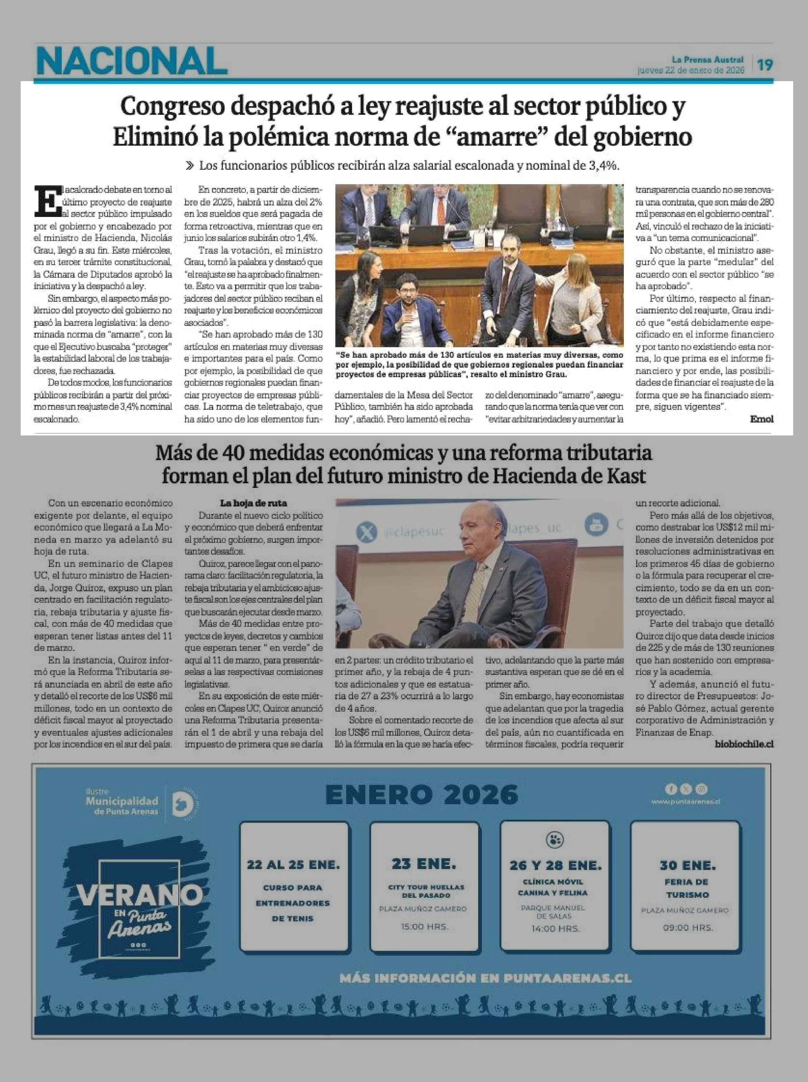 Congreso despachó a ley reajuste al sector público y Eliminó la polémica norma de "amarre" del gobierno 22-01-2026 La Prensa Austral |