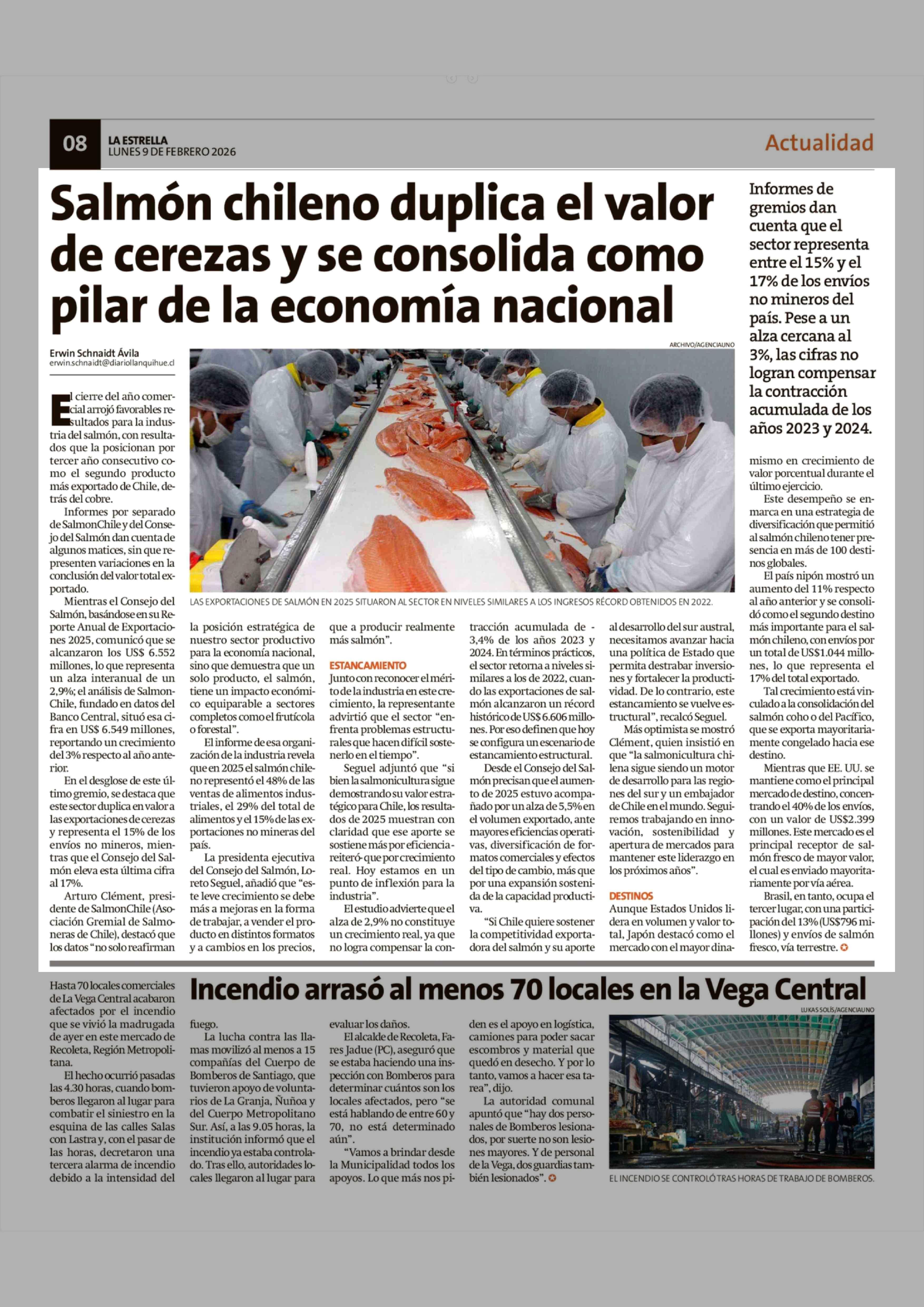 Salmón chileno duplica el valor de cerezas y se consolida como pilar de la economía nacional 09-02-2026 La Estrella de Chiloé |