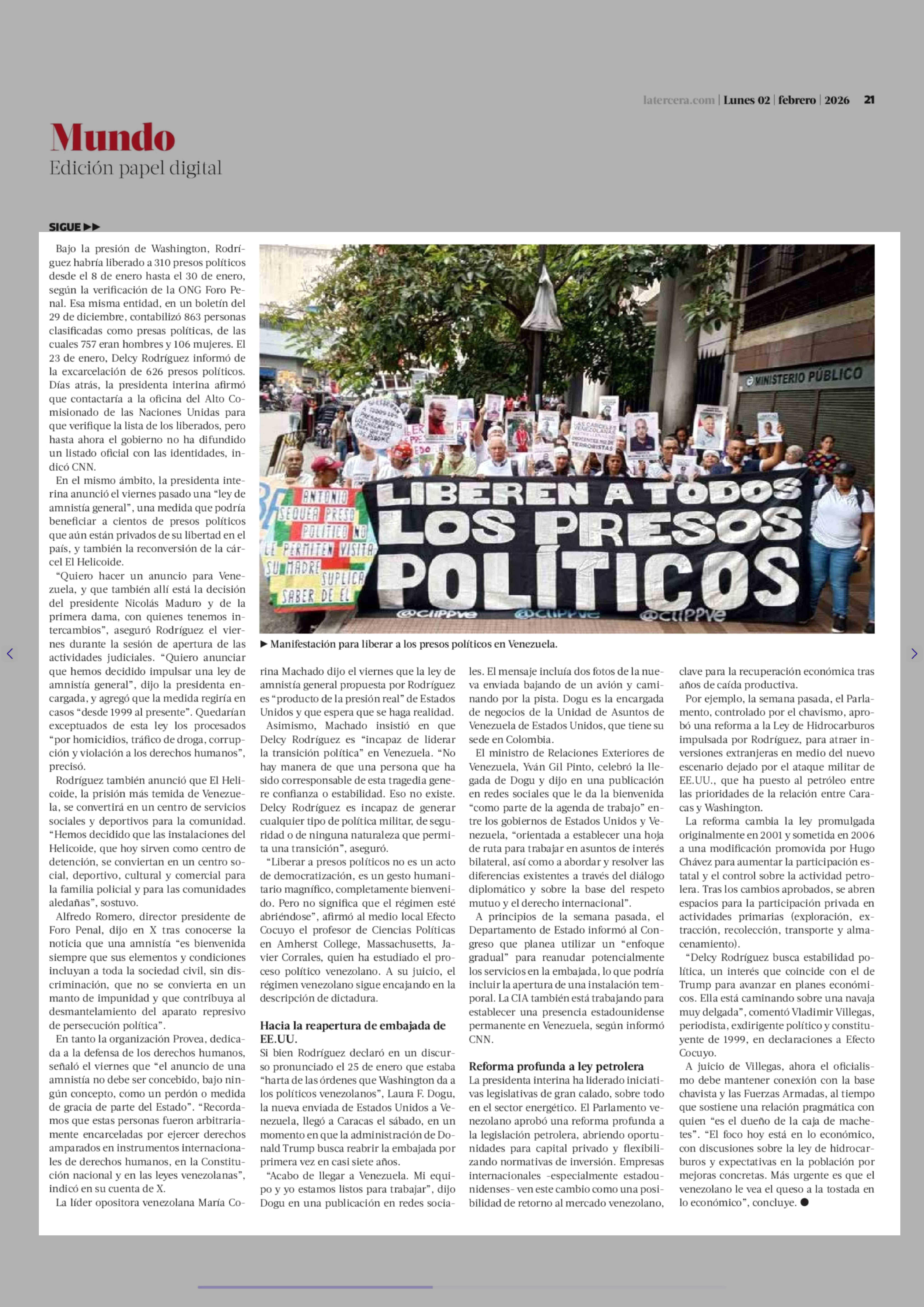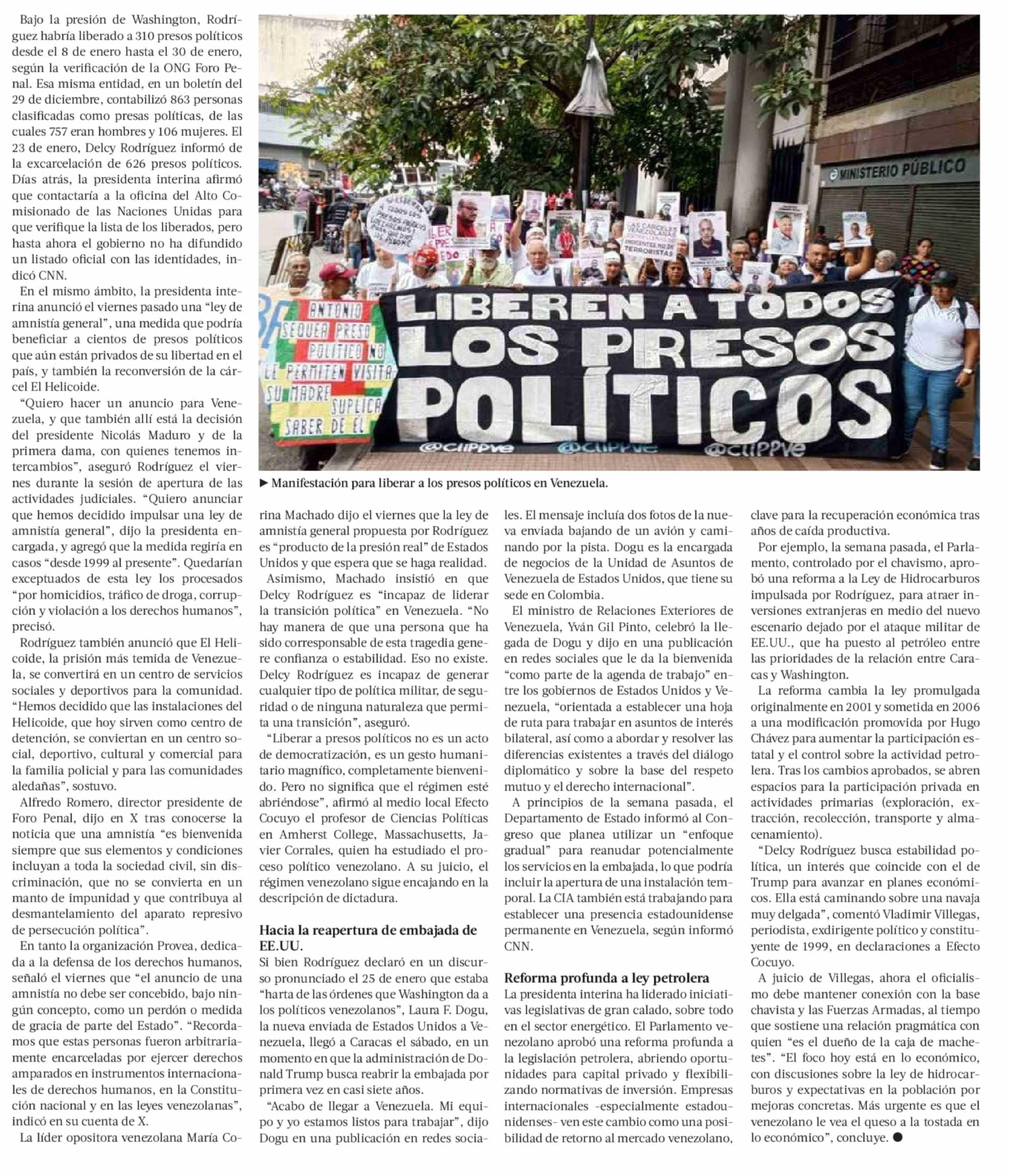 Liberación de presos políticos, cambios en las FF.AA. y ley de hidrocarburos: las medidas de Delcy Rodríguez a un mes de la captura de Maduro 02-02-2026 La Tercera |
