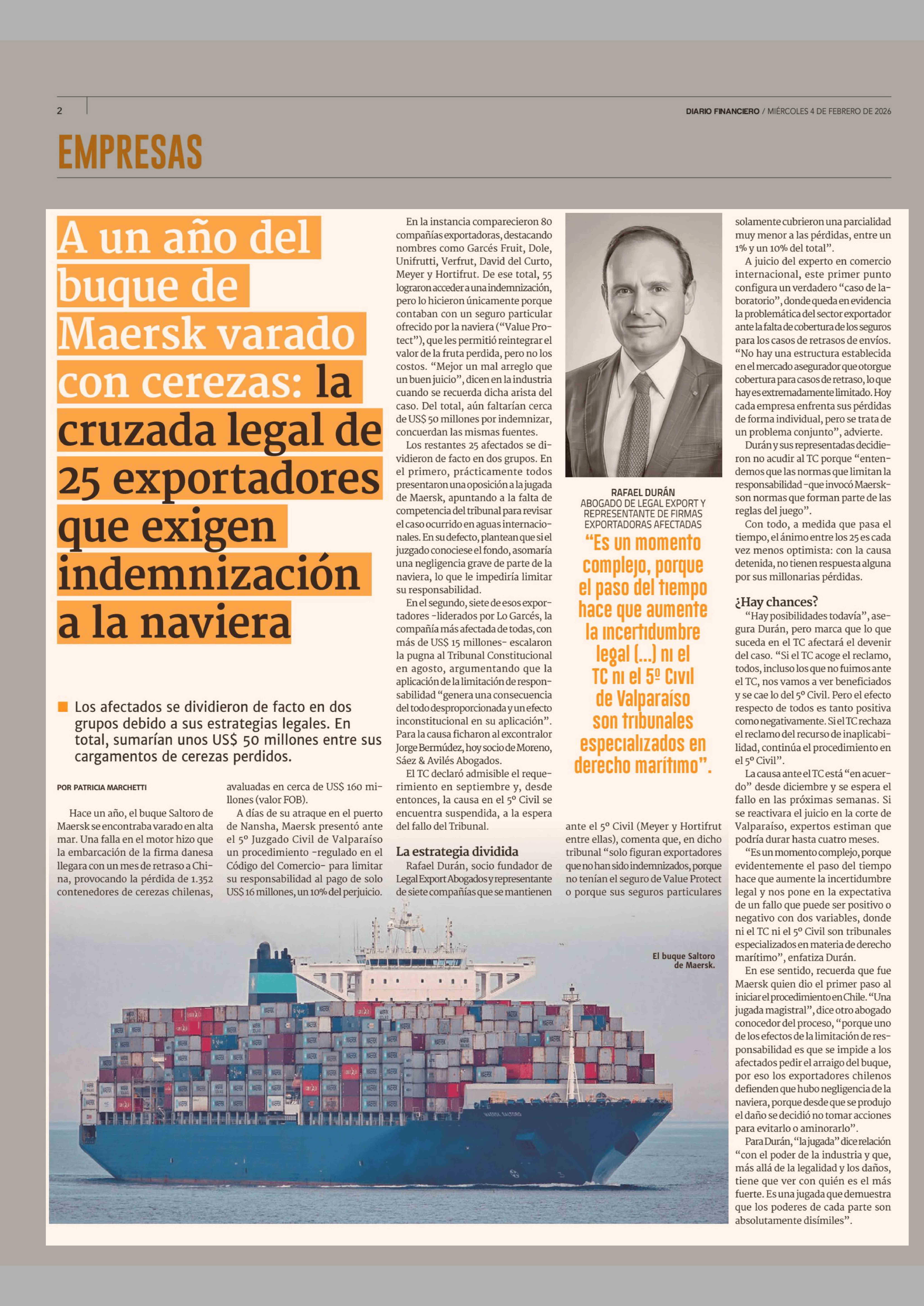 A un año del buque de Maersk varado con cerezas: la cruzada legal de 25 exportadores que exigen indemnización a la naviera 04-02-2026 Diario Financiero |