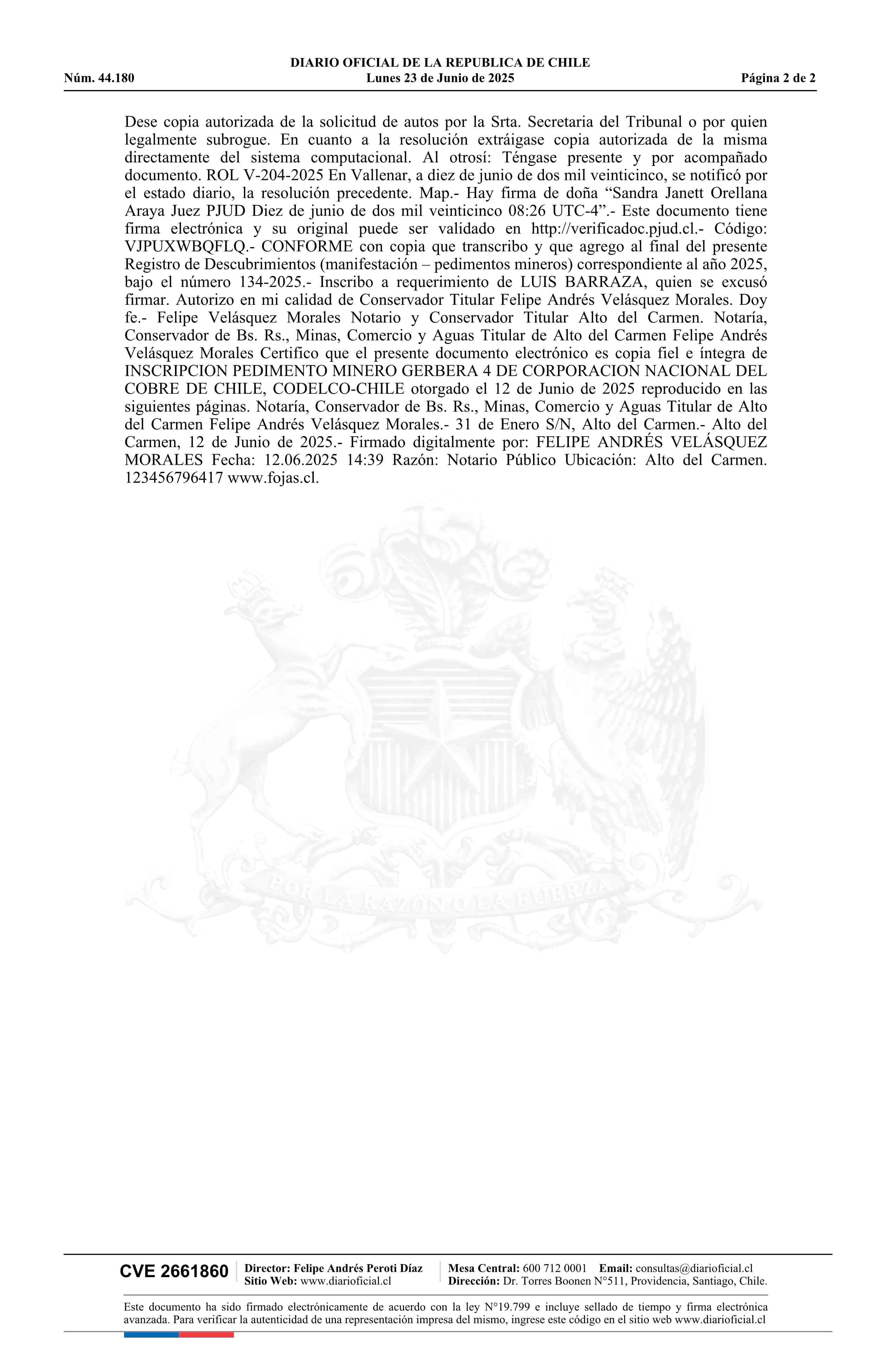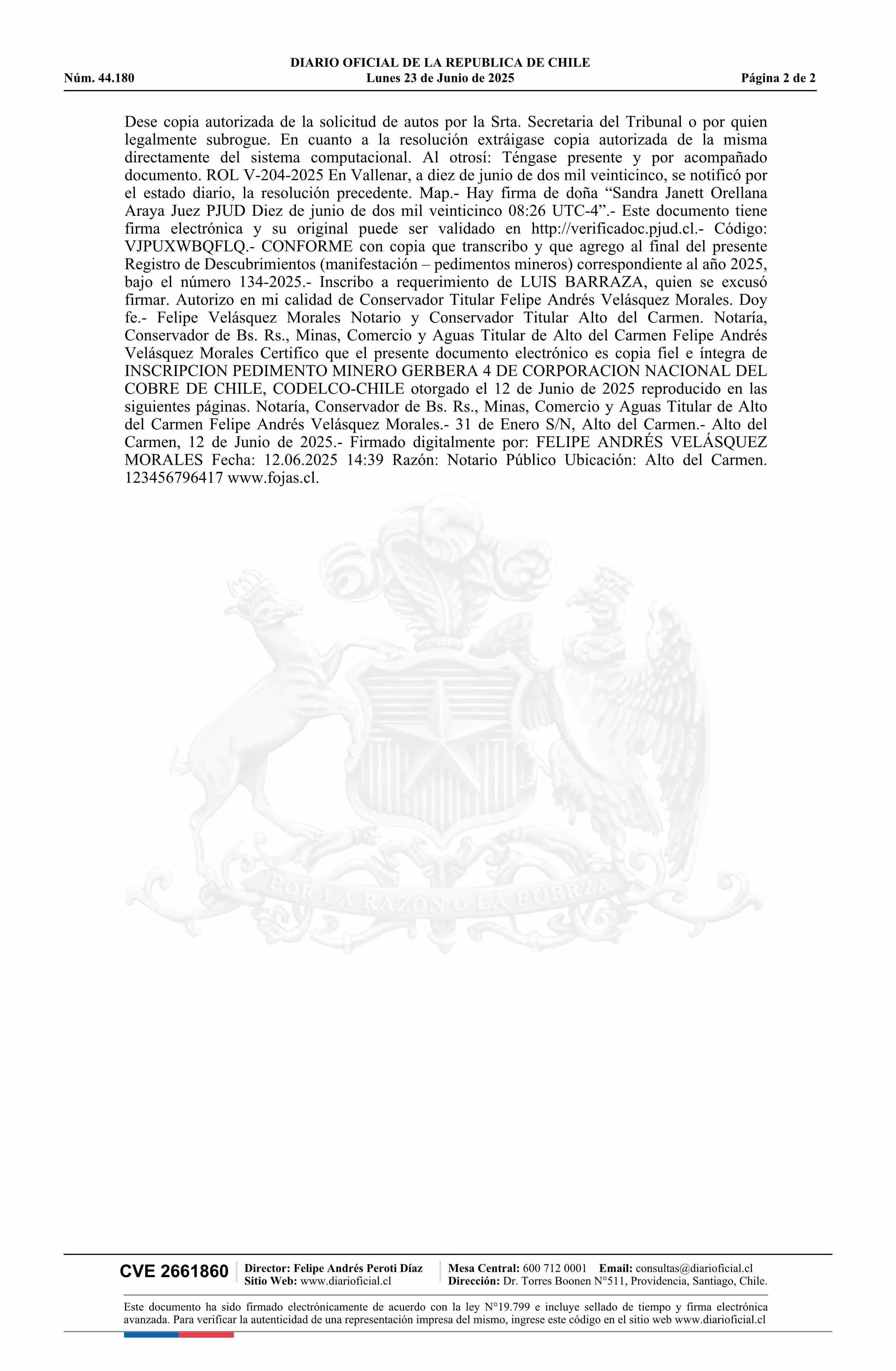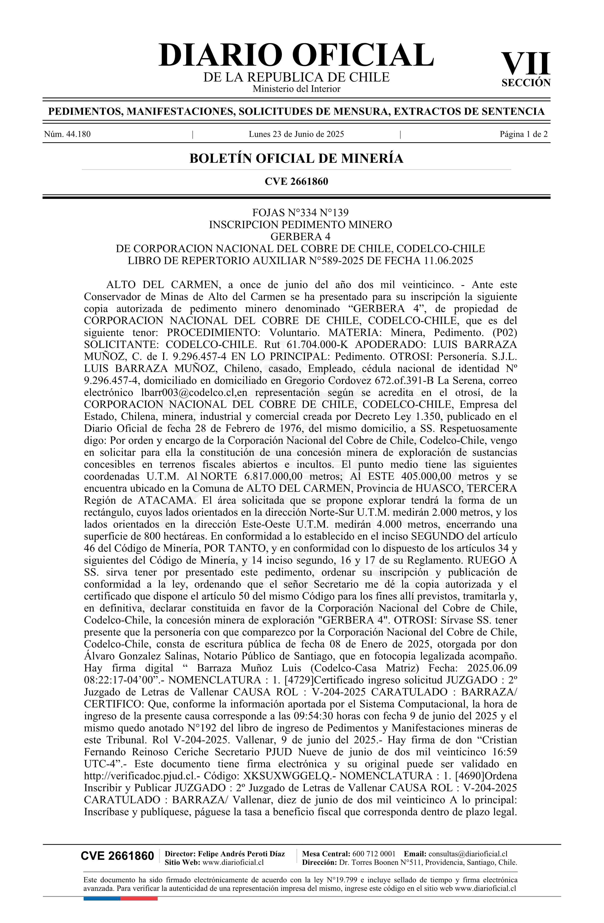 GERBERA 4 / Corporación Nacional del Cobre de Chile 23-06-2025 DIARIO OFICIAL CHILE - BOLETÍN OFICIAL DE MINERÍA |