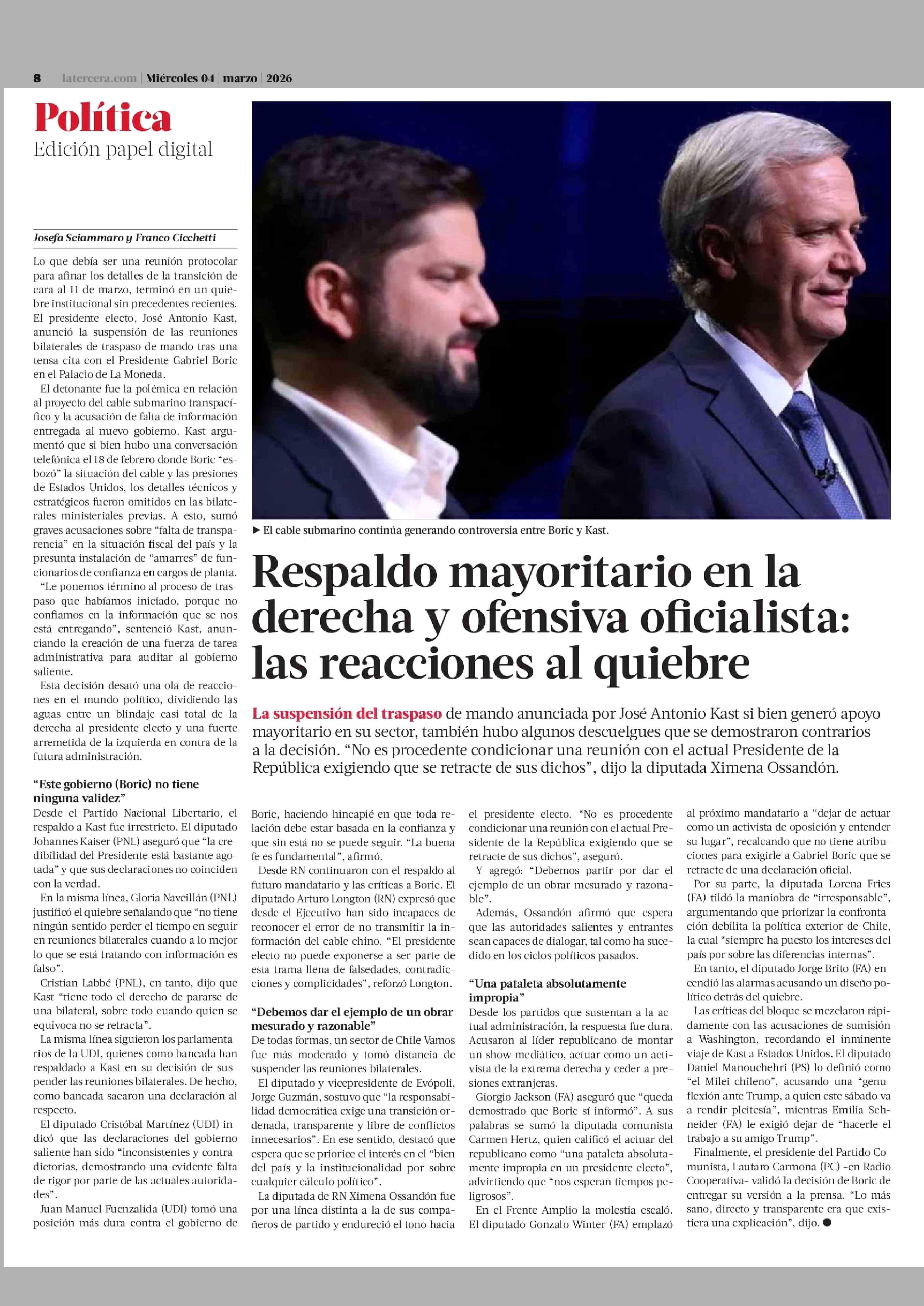 Respaldo mayoritario en la derecha y ofensiva oficialista: las reacciones al quiebre 04-03-2026 La Tercera |