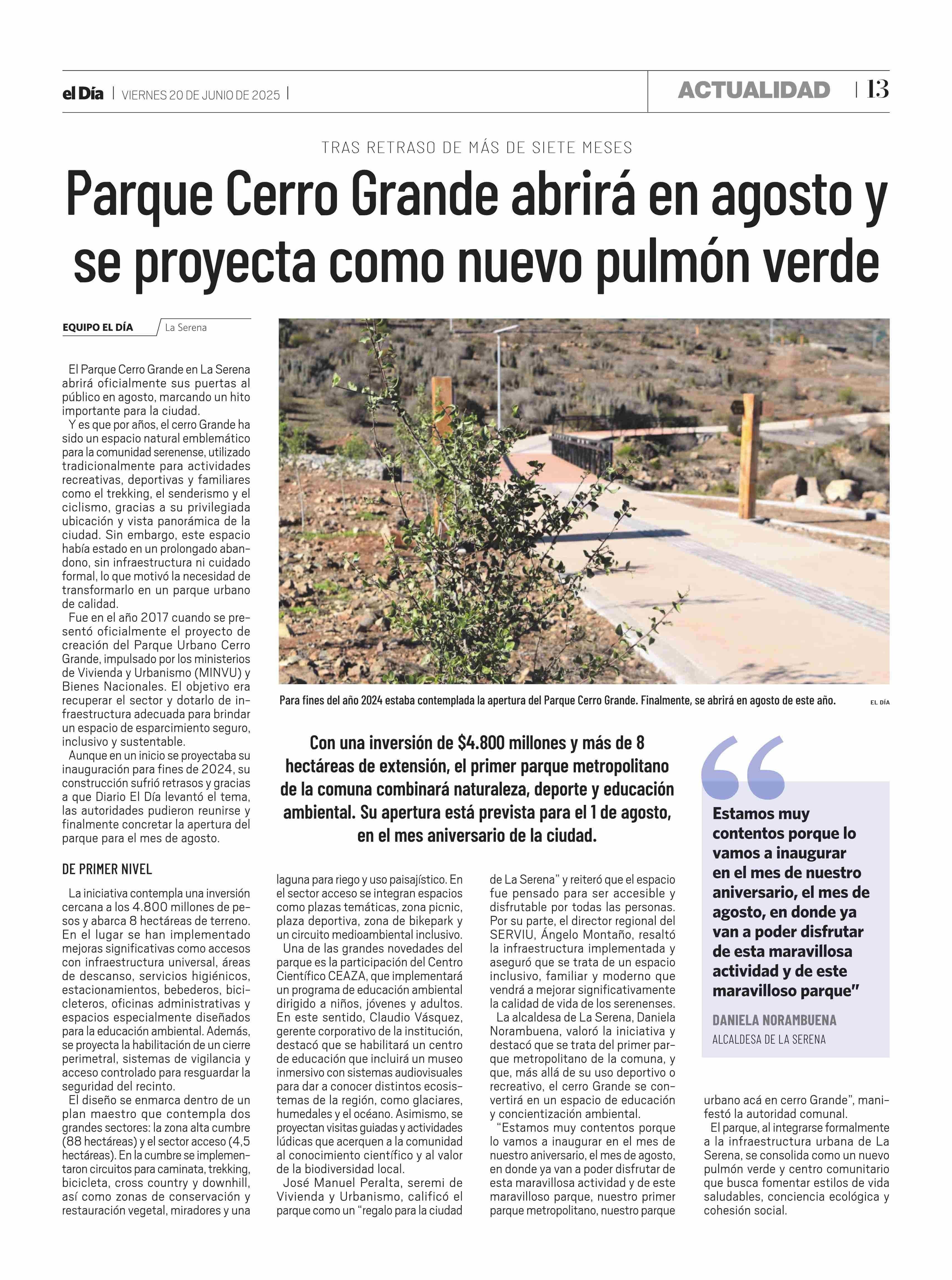 Parque Cerro Grande abrirá en agosto y se proyecta como nuevo pulmón verde 20-06-2025 El Día |