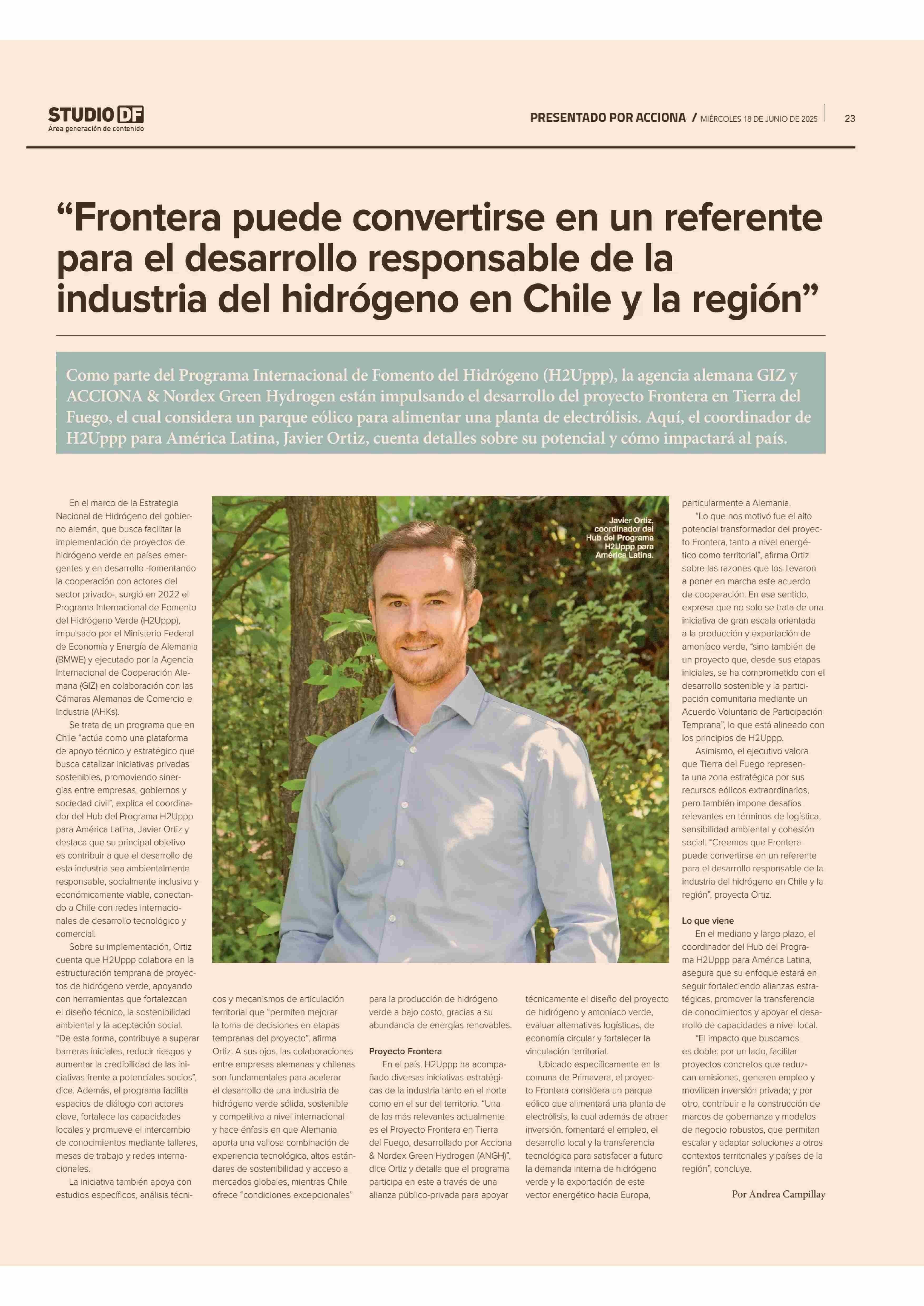 “Frontera puede convertirse en un referente para el desarrollo responsable de la industria del hidrógeno en Chile y la región” 18-06-2025 Diario Financiero |