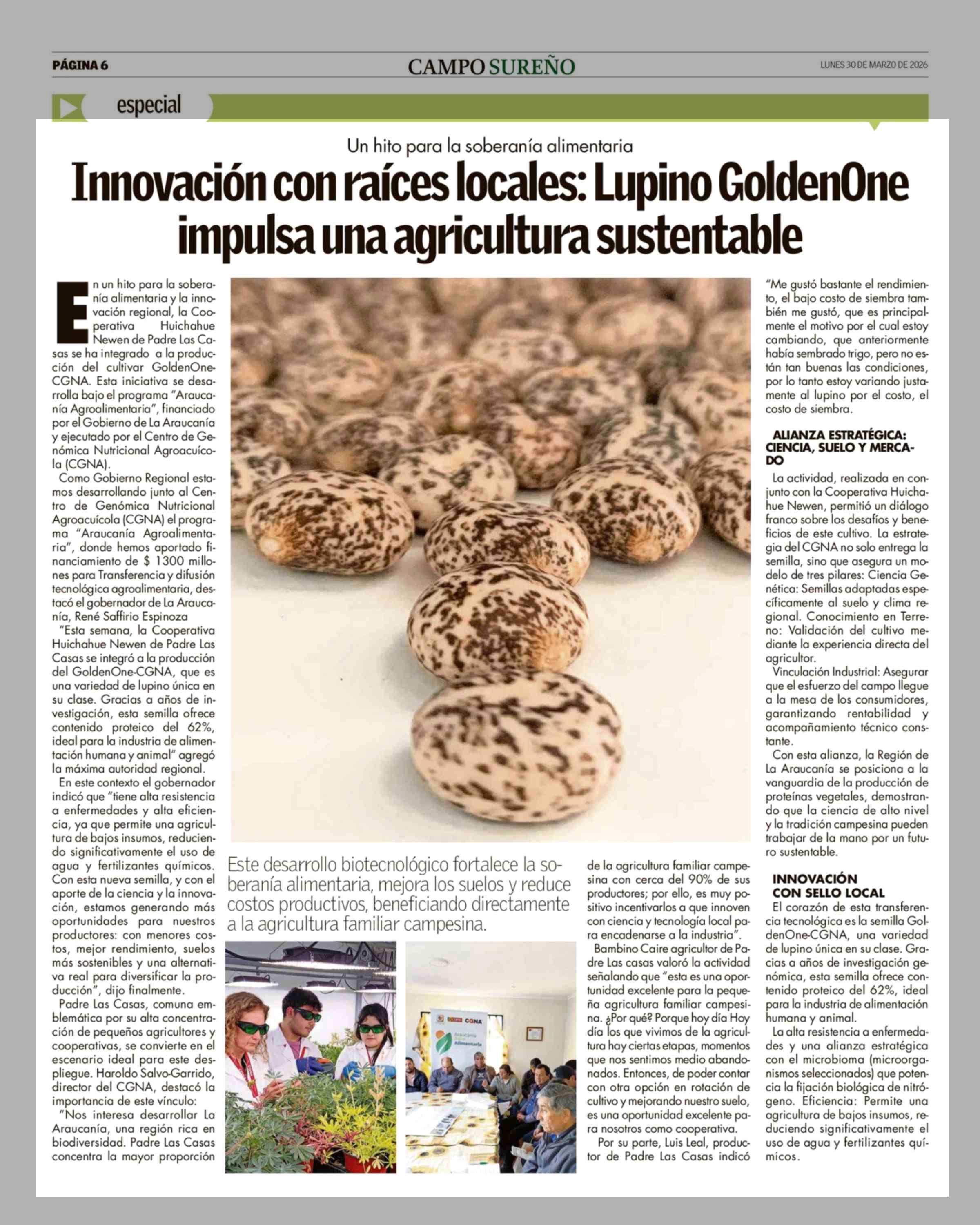 Innovación con raíces locales: Lupino GoldenOne impulsa una agricultura sustentable 30-03-2026 Campo Sureño - Regiones IX, X y XIV |