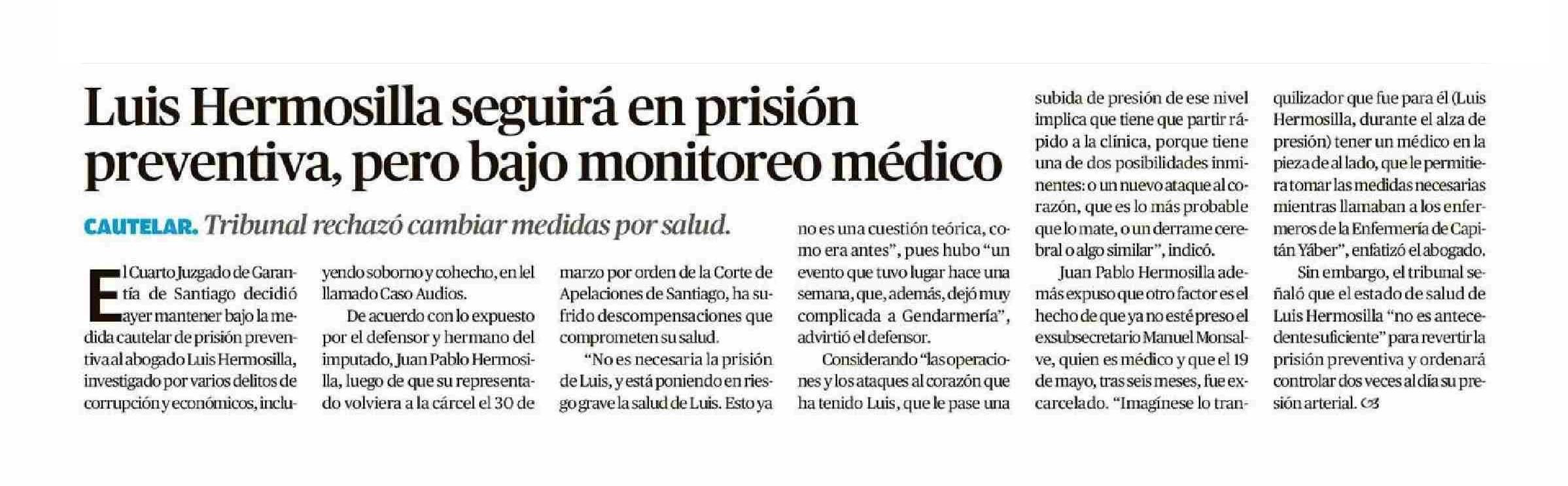 | Título: | Luis Hermosilla seguirá en prisión preventiva, pero bajo monitoreo médico |