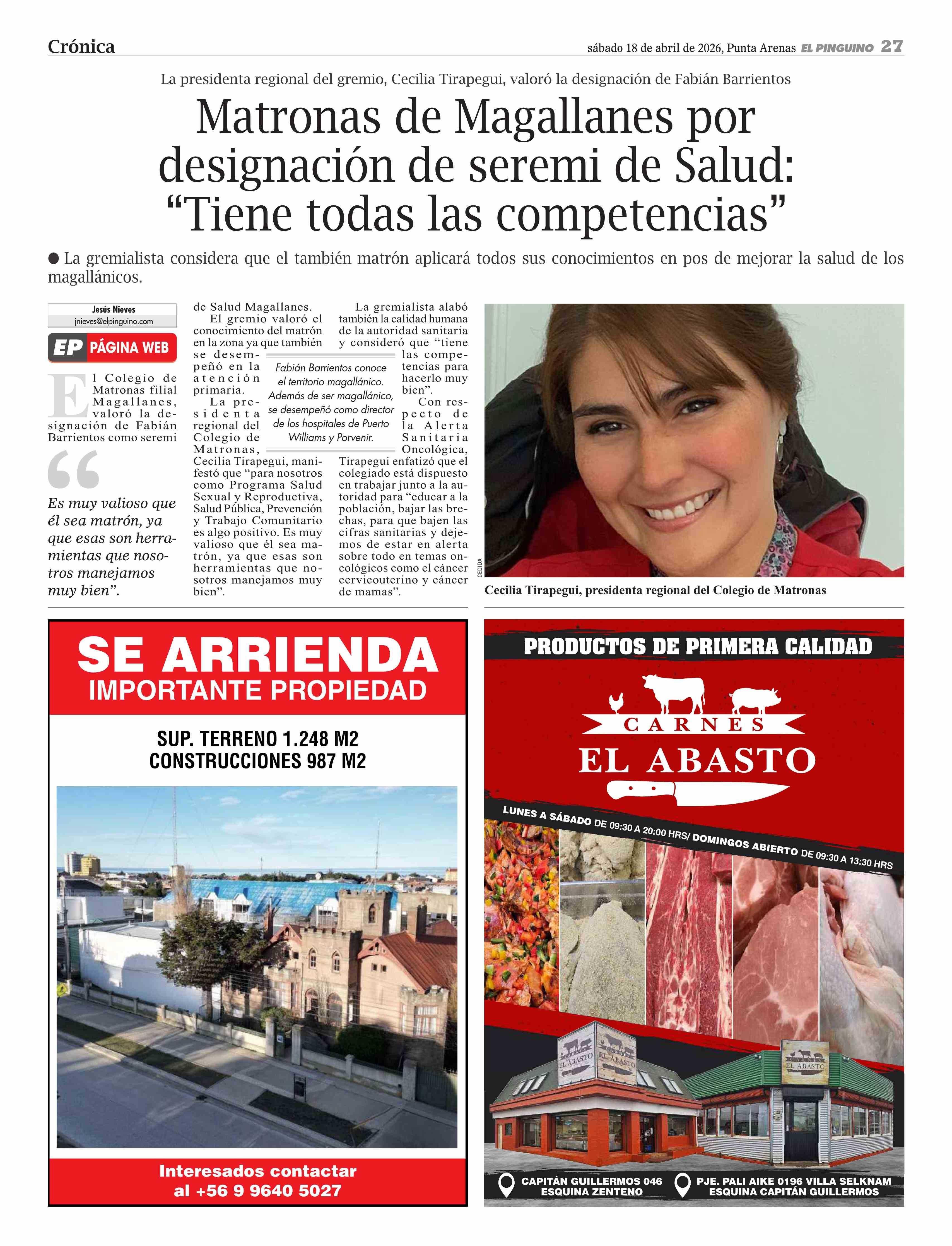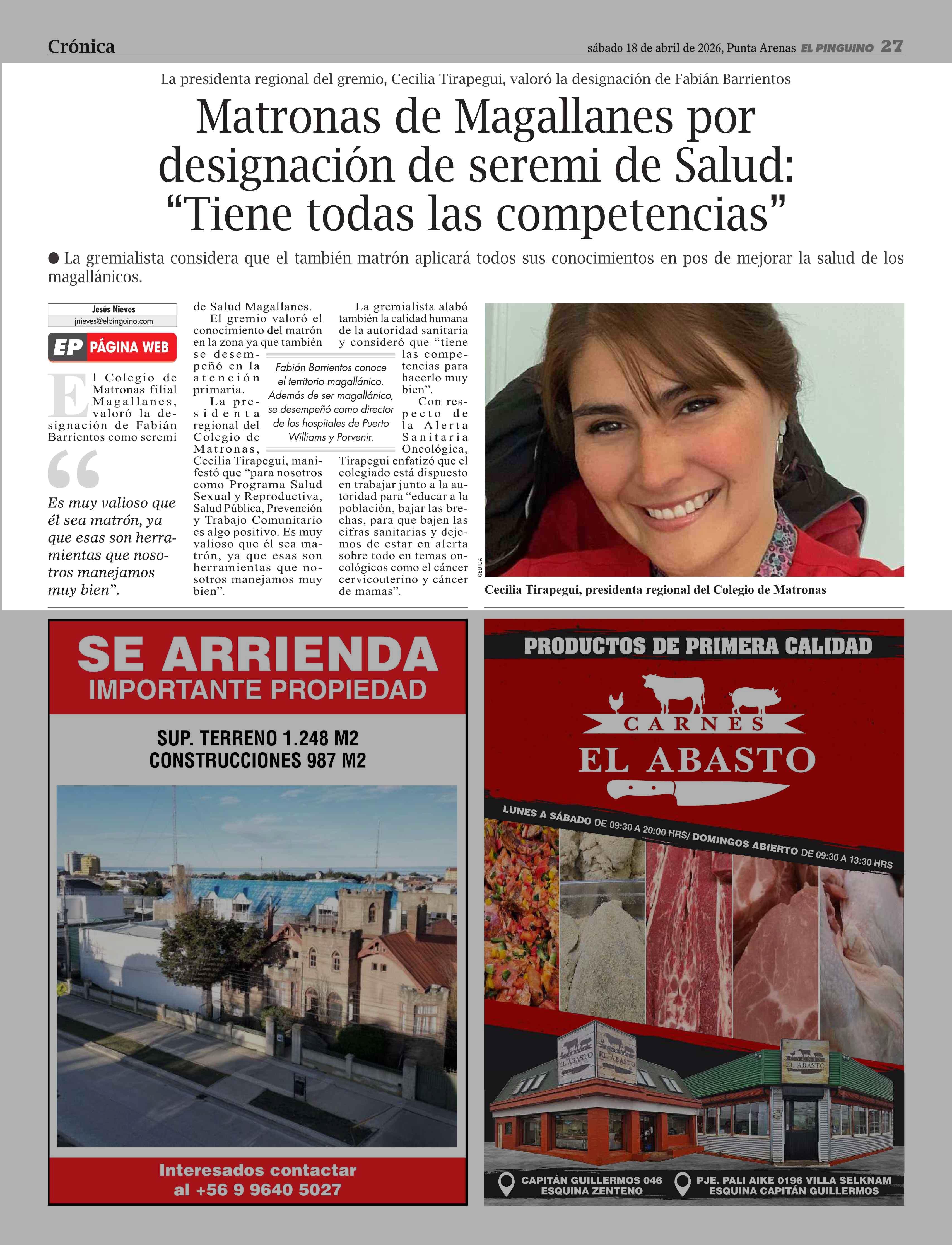 Matronas de Magallanes por designación de seremi de Salud: “Tiene todas las competencias” 18-04-2026 El Pingüino |