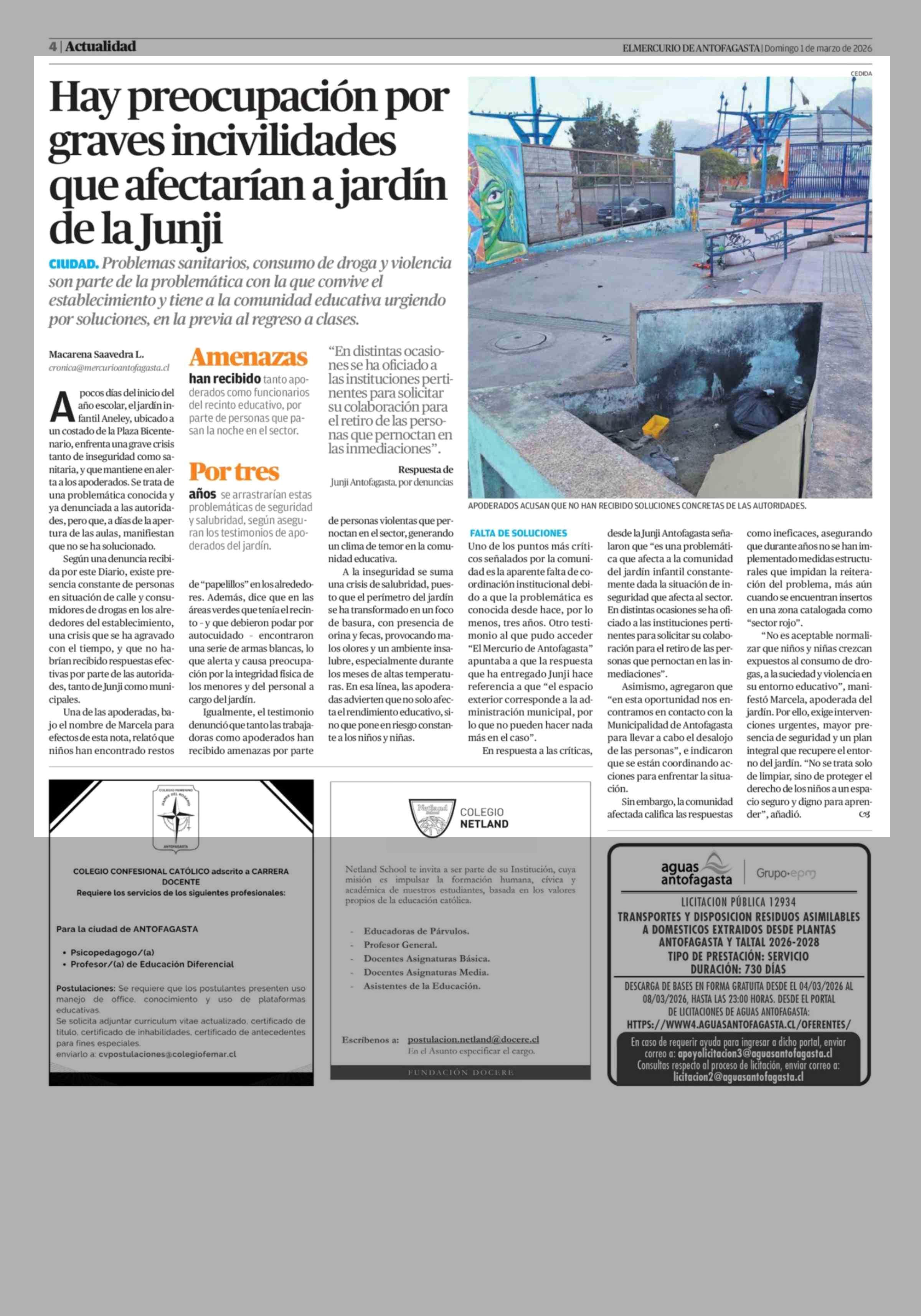 Hay preocupación por graves incivilidades que afectarían a jardín de la Junji 01-03-2026 El Mercurio de Antofagasta |