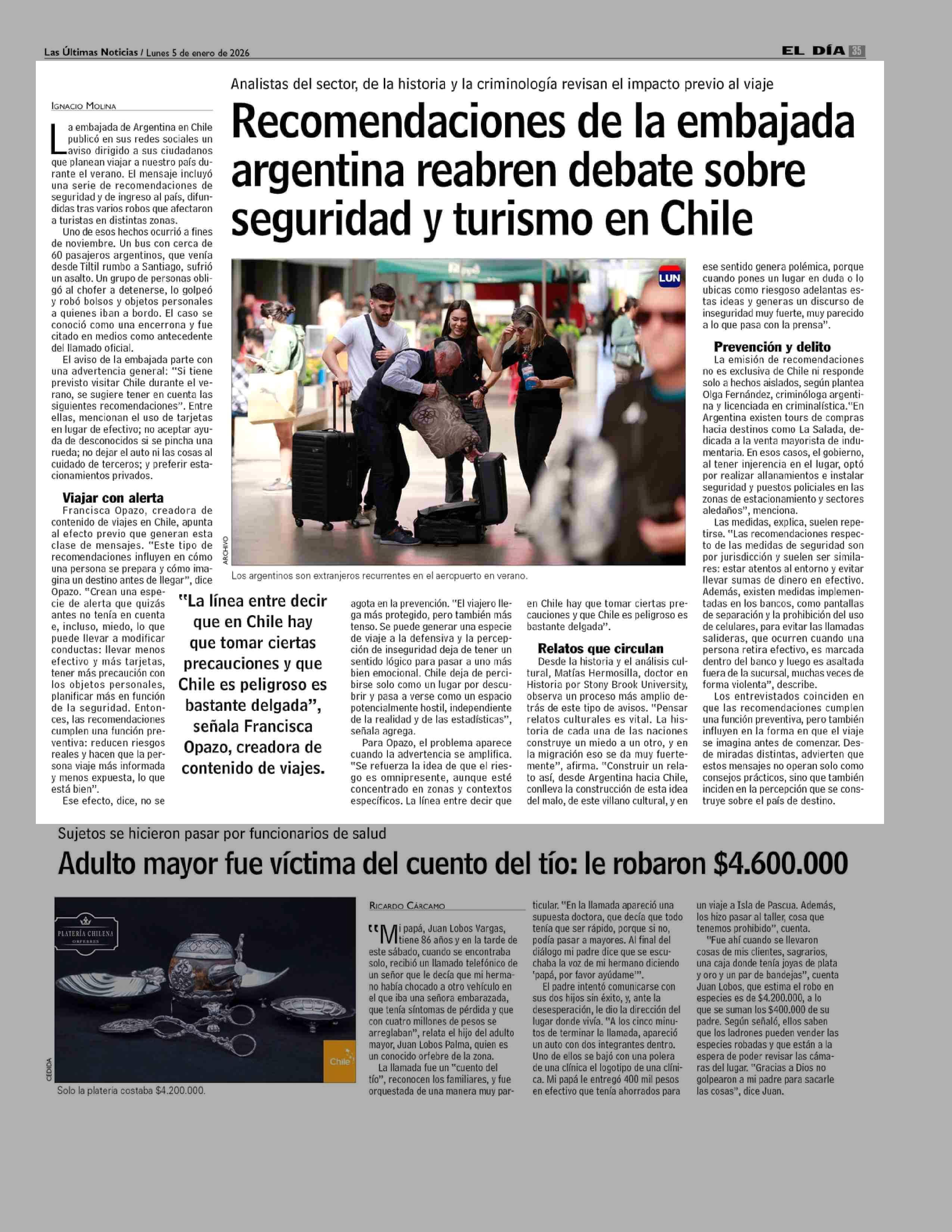 Recomendaciones de la embajada argentina reabren debate sobre seguridad y turismo en Chile 05-01-2026 Las Últimas Noticias |