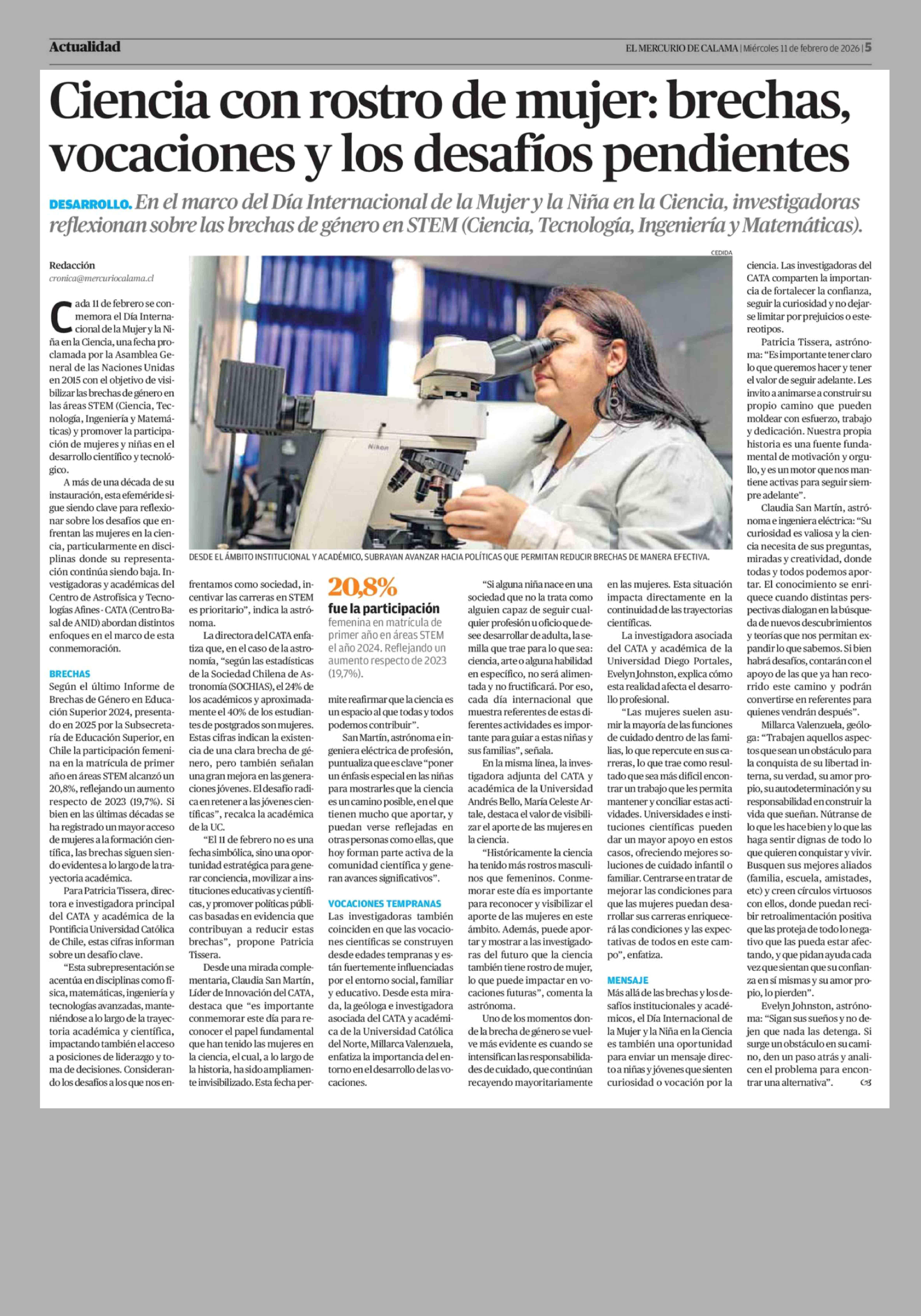 Ciencia con rostro de mujer: brechas, vocaciones y los desafíos pendientes 11-02-2026 El Mercurio de Calama |