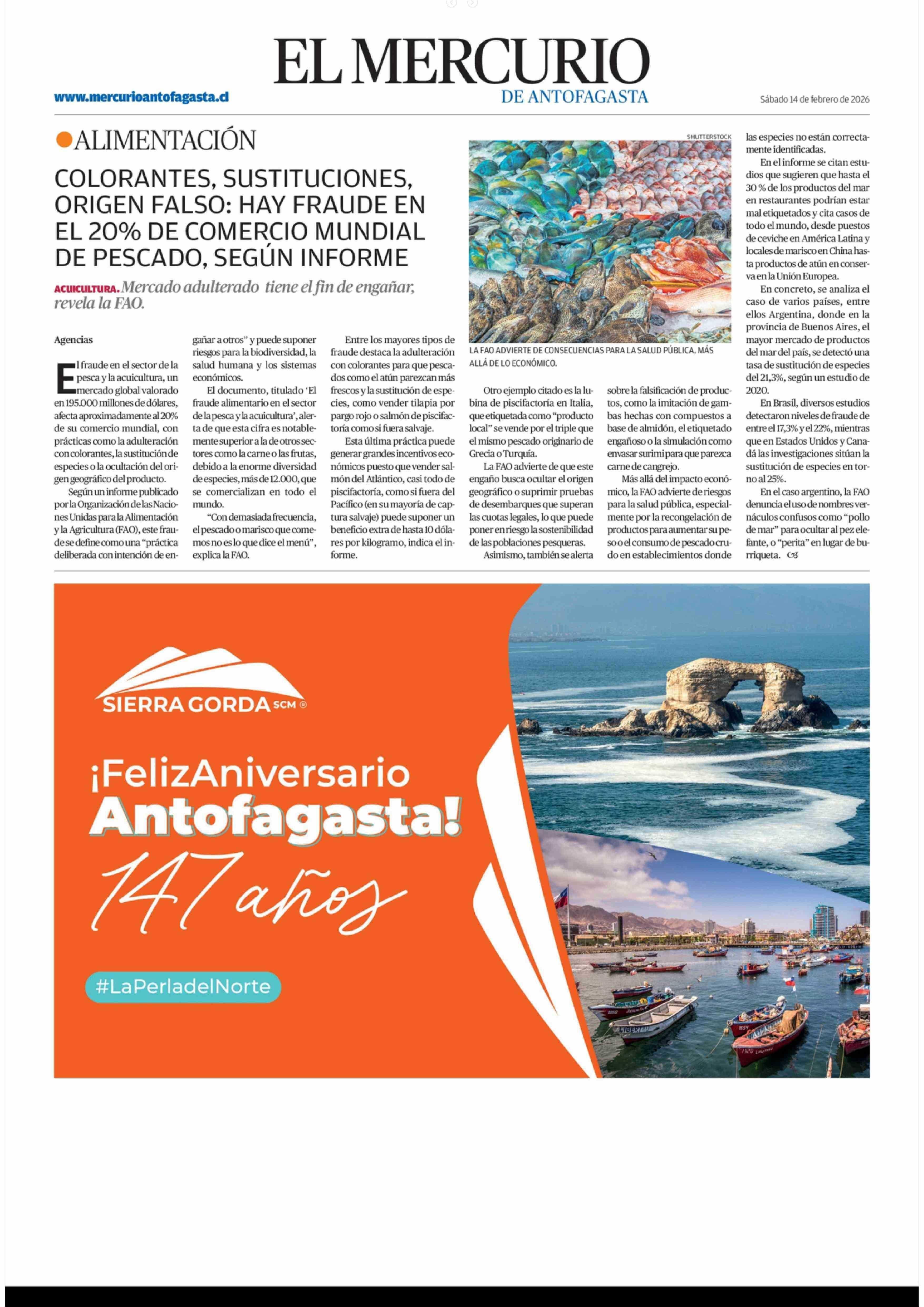 COLORANTES, SUSTITUCIONES, ORIGEN FALSO: HAY FRAUDE EN EL 20% DE COMERCIO MUNDIAL DE PESCADO, SEGÚN INFORME 14-02-2026 El Mercurio de Antofagasta |