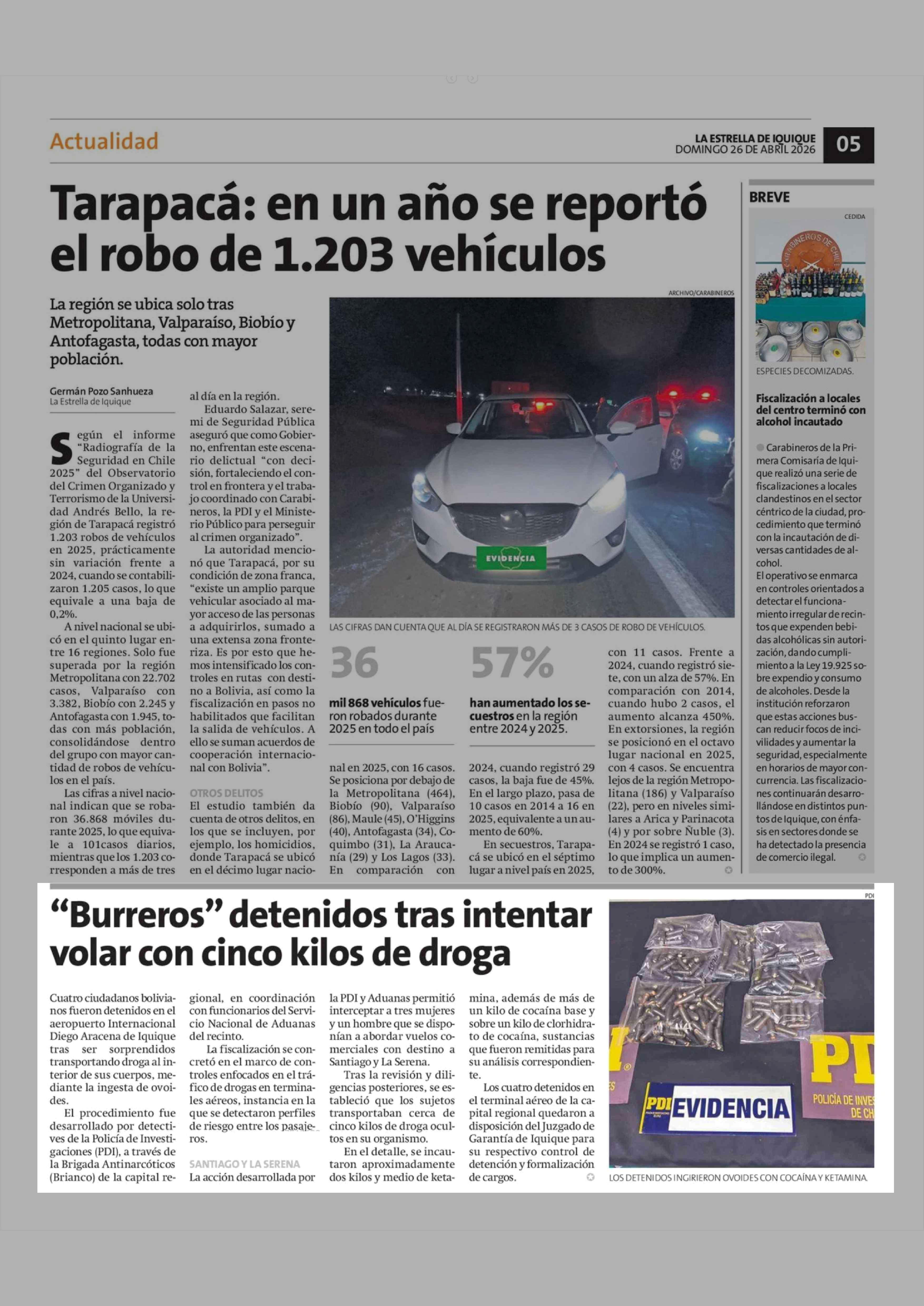 "Burreros" detenidos tras intentar volar con cinco kilos de droga 26-04-2026 La Estrella de Iquique |