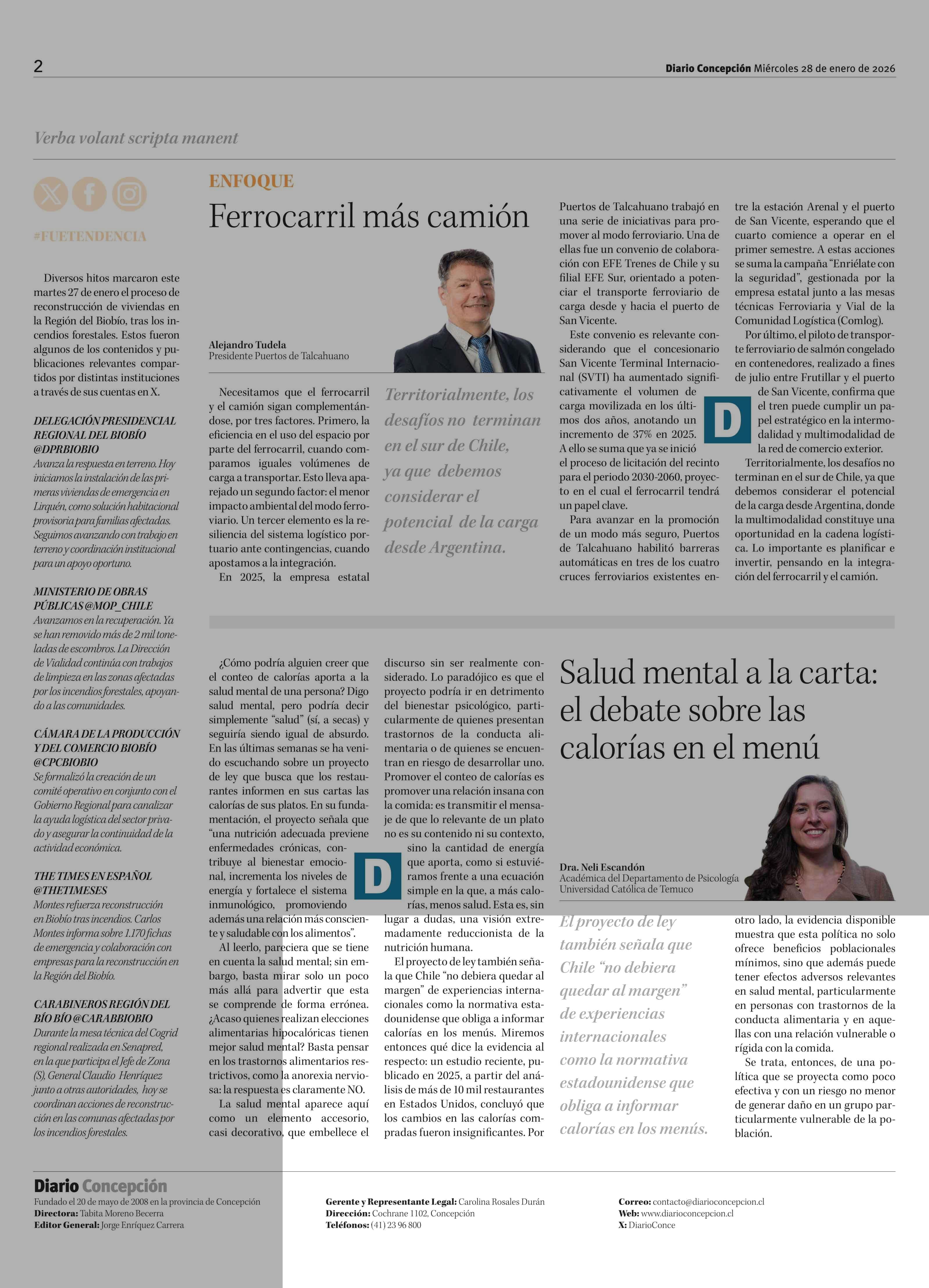 Columnas de Opinión: Salud mental a la carta: el debate sobre las calorías en el menú 28-01-2026 Diario Concepción |