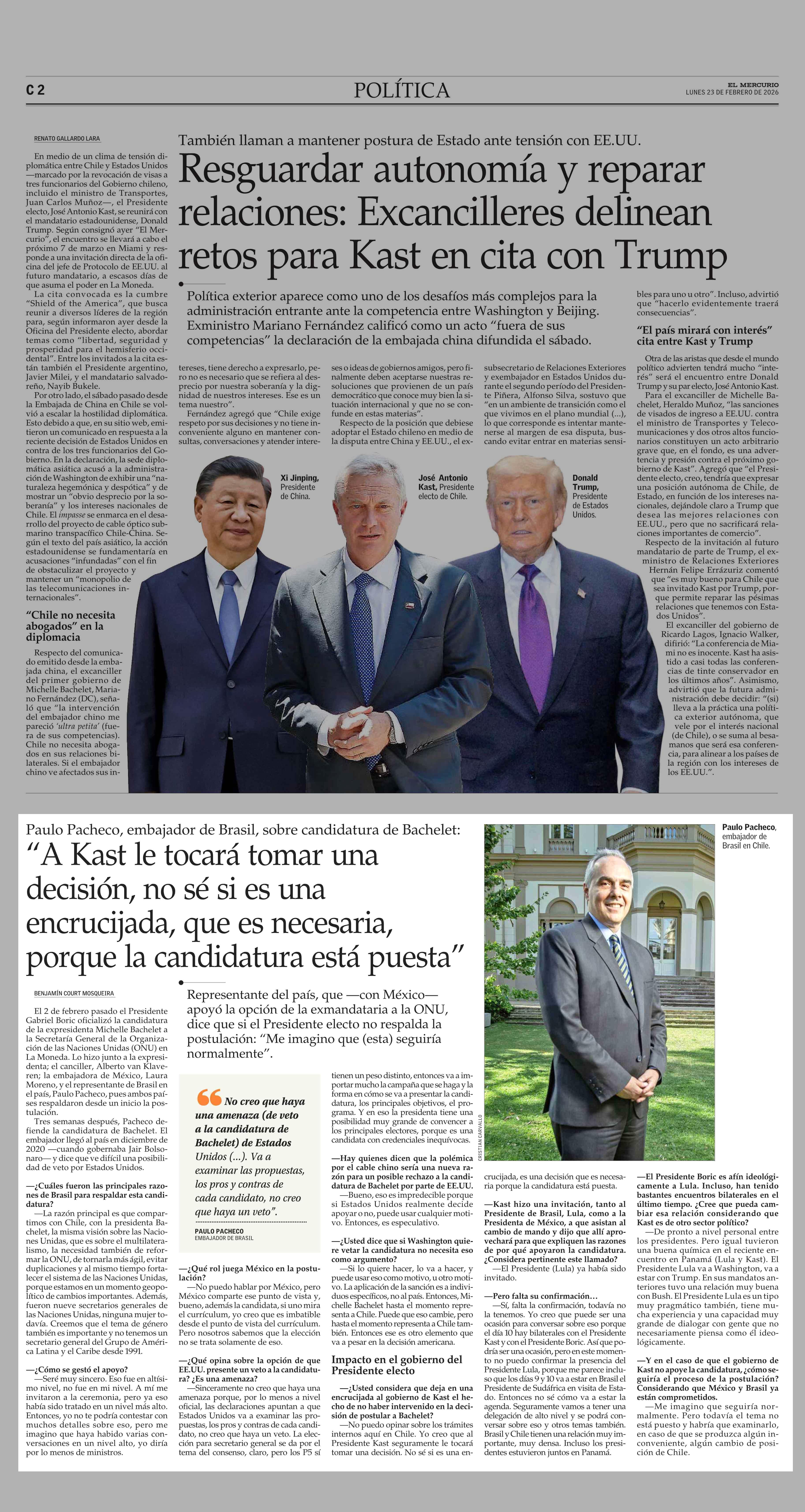 “A Kast le tocará tomar una decisión, no sé si es una encrucijada, que es necesaria, porque la candidatura está puesta” 23-02-2026 El Mercurio |