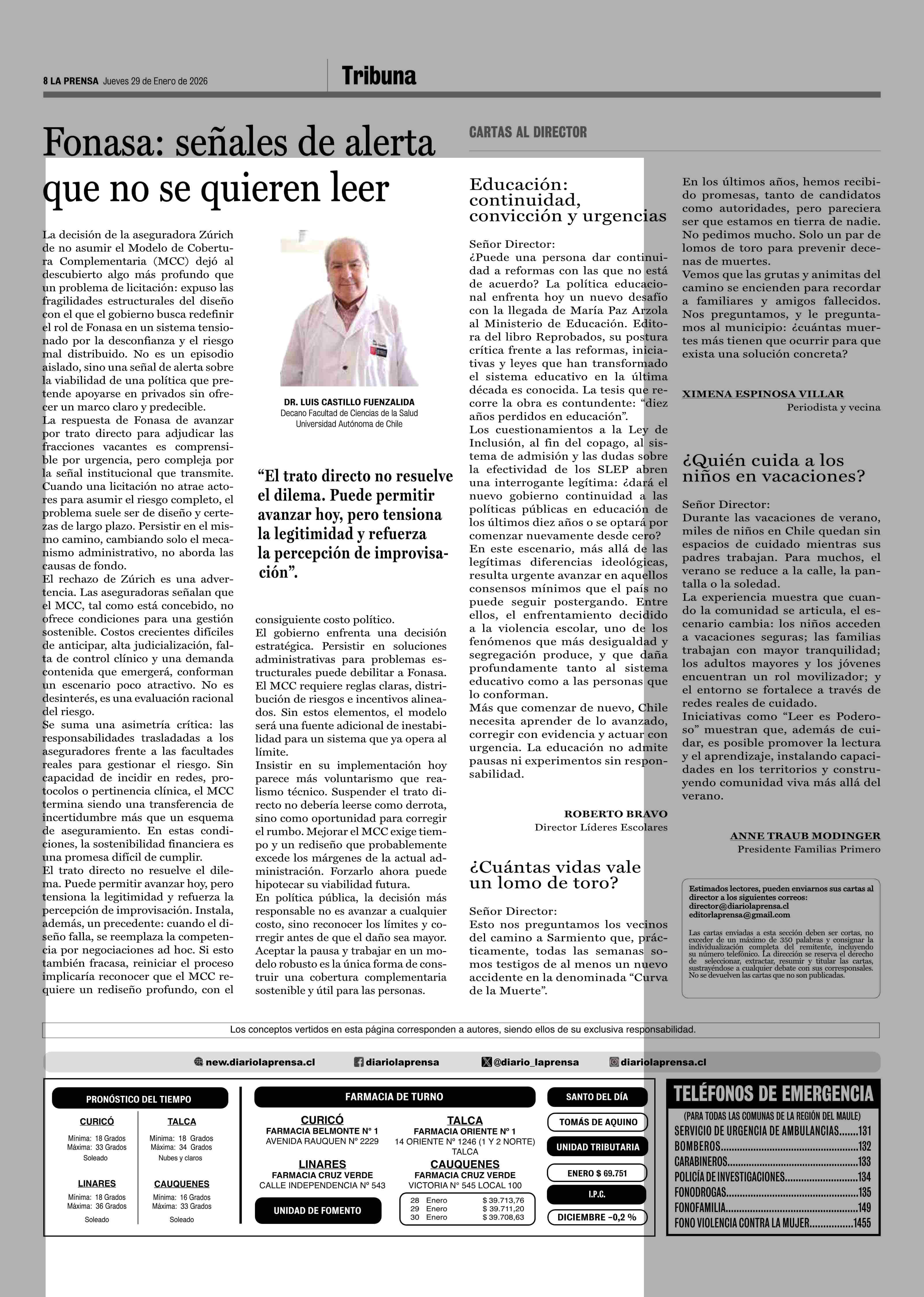 Columnas de Opinión: Fonasa: señales de alerta que no se quieren leer 29-01-2026 La Prensa de Curicó |