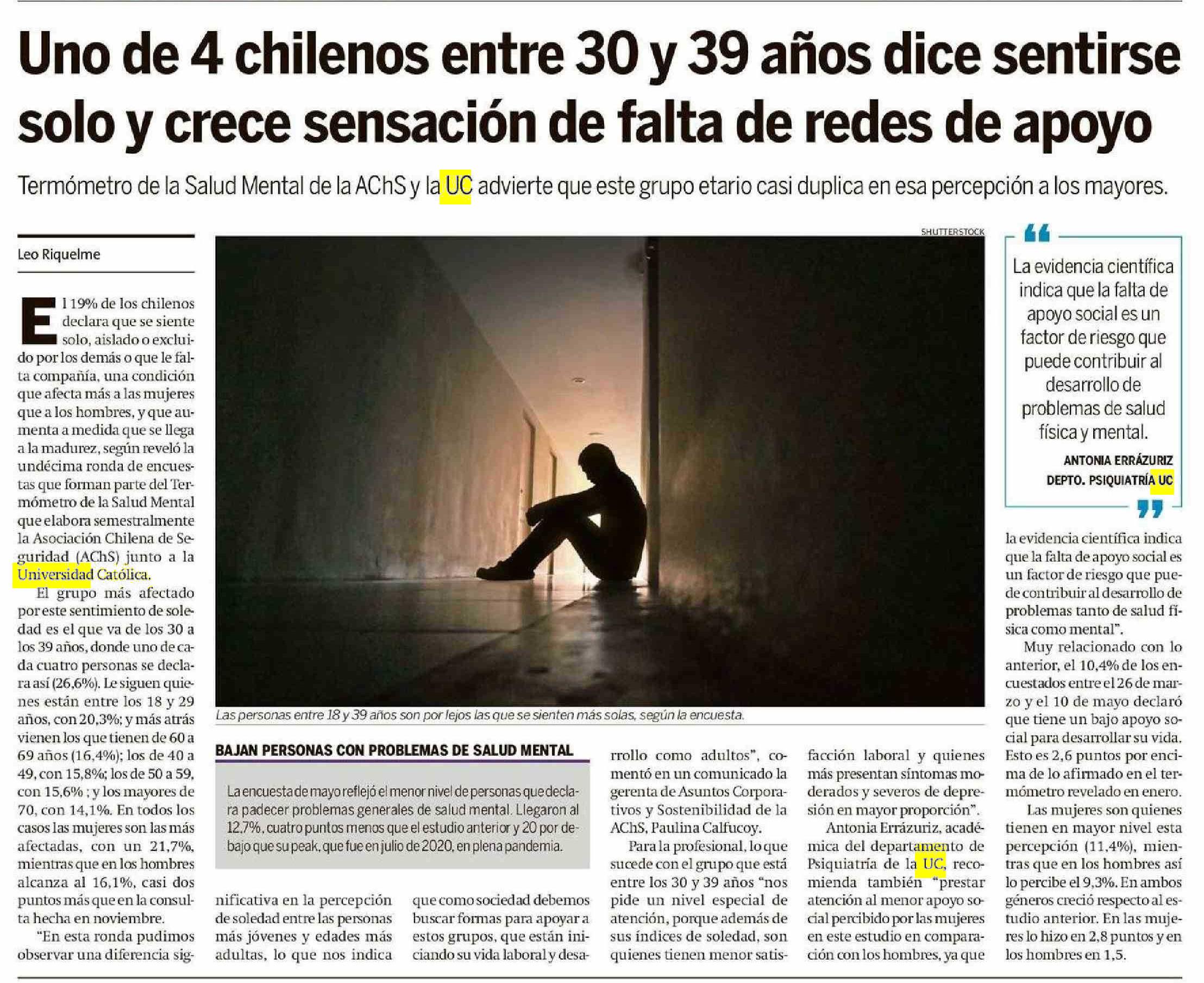 | Título: | Uno de 4 chilenos entre 30 y 39 años dice sentirse solo y crece sensación de falta de redes de apoyo |