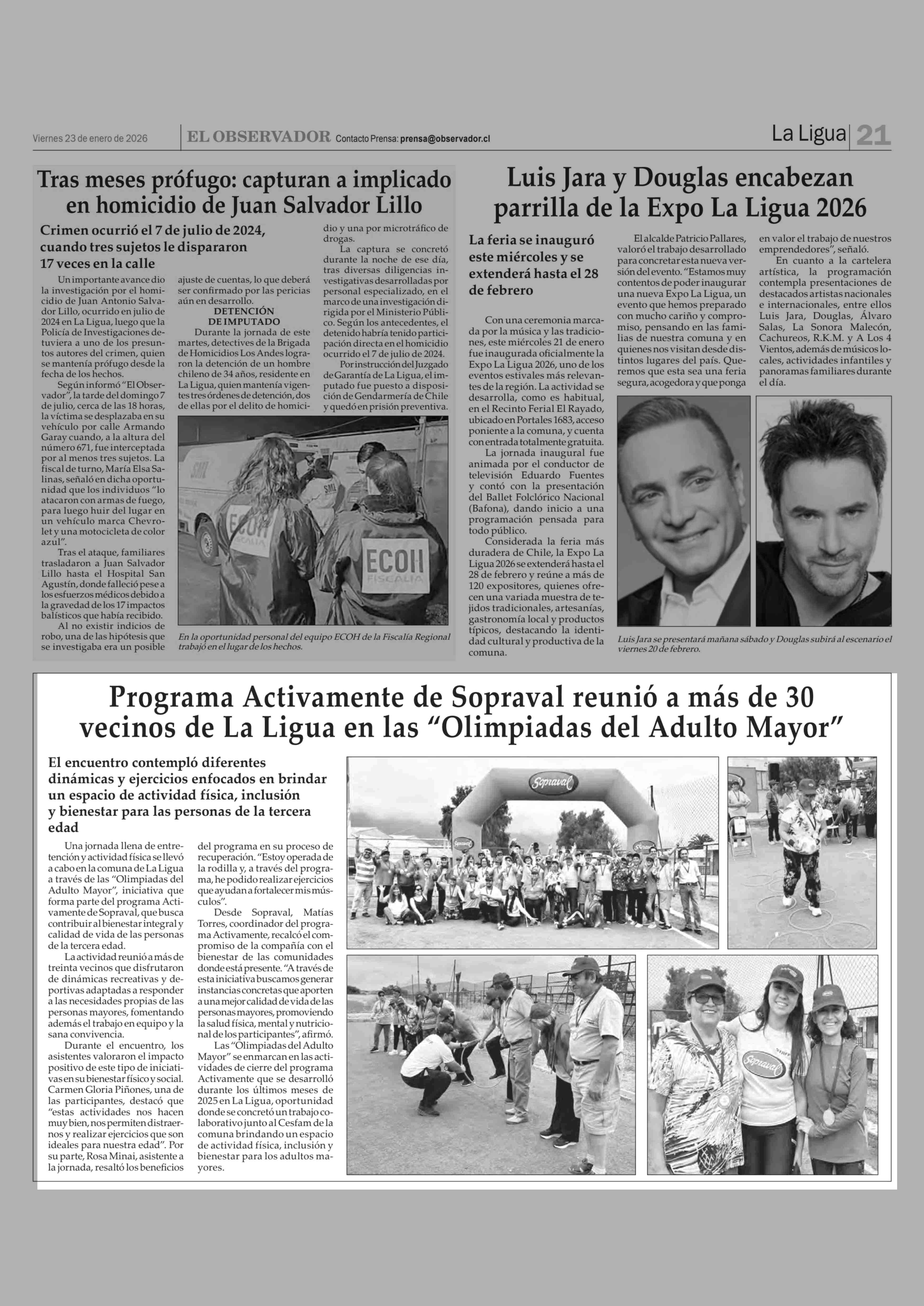 Programa Activamente de Sopraval reunió a más de 30 vecinos de La Ligua en las "Olimpiadas del Adulto Mayor" 23-01-2026 El Observador |