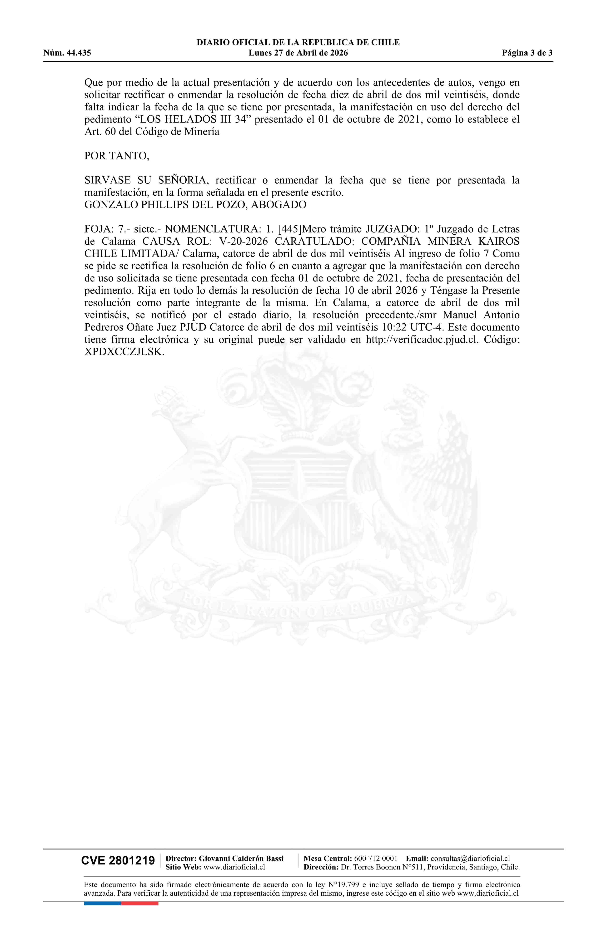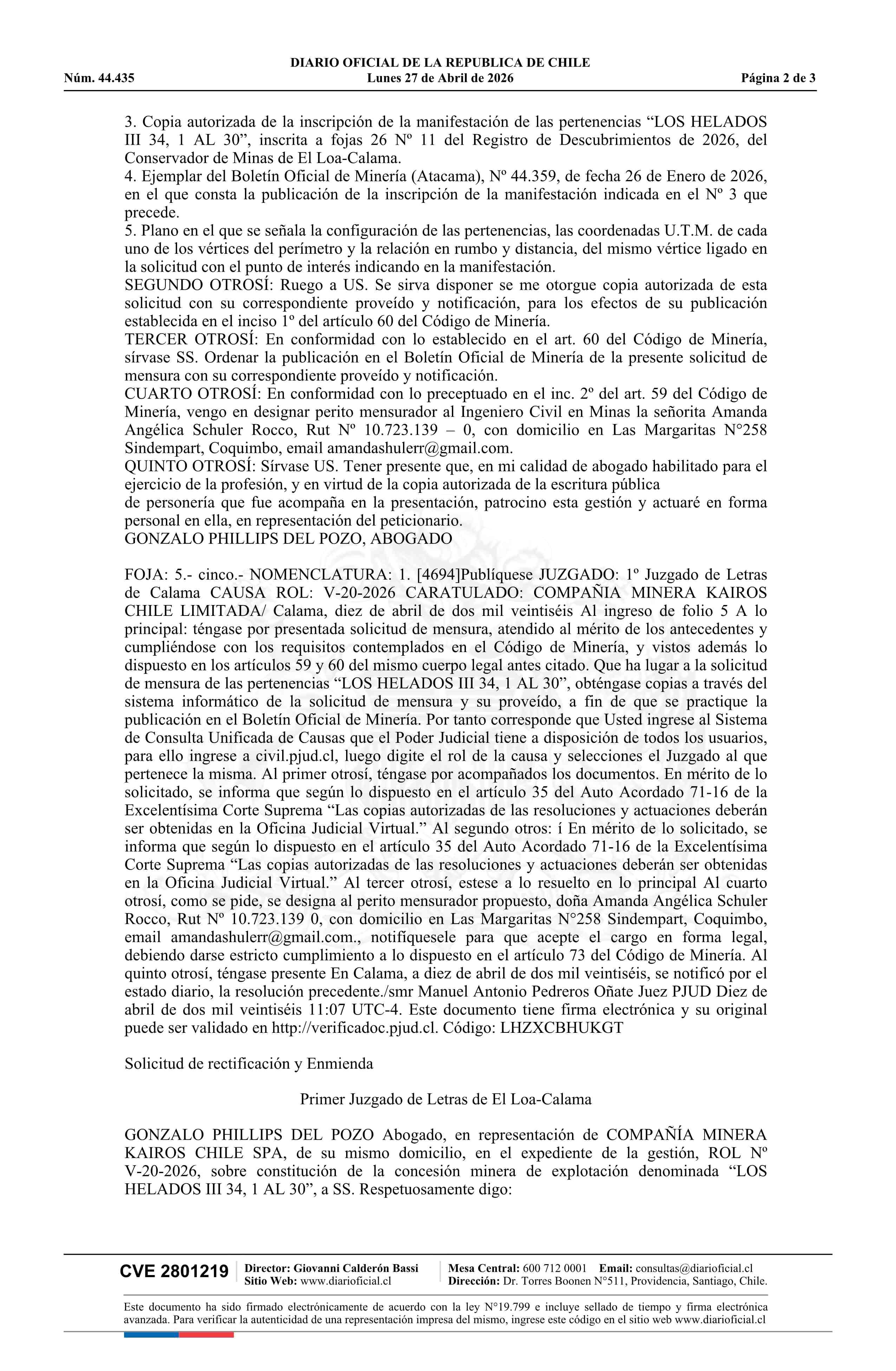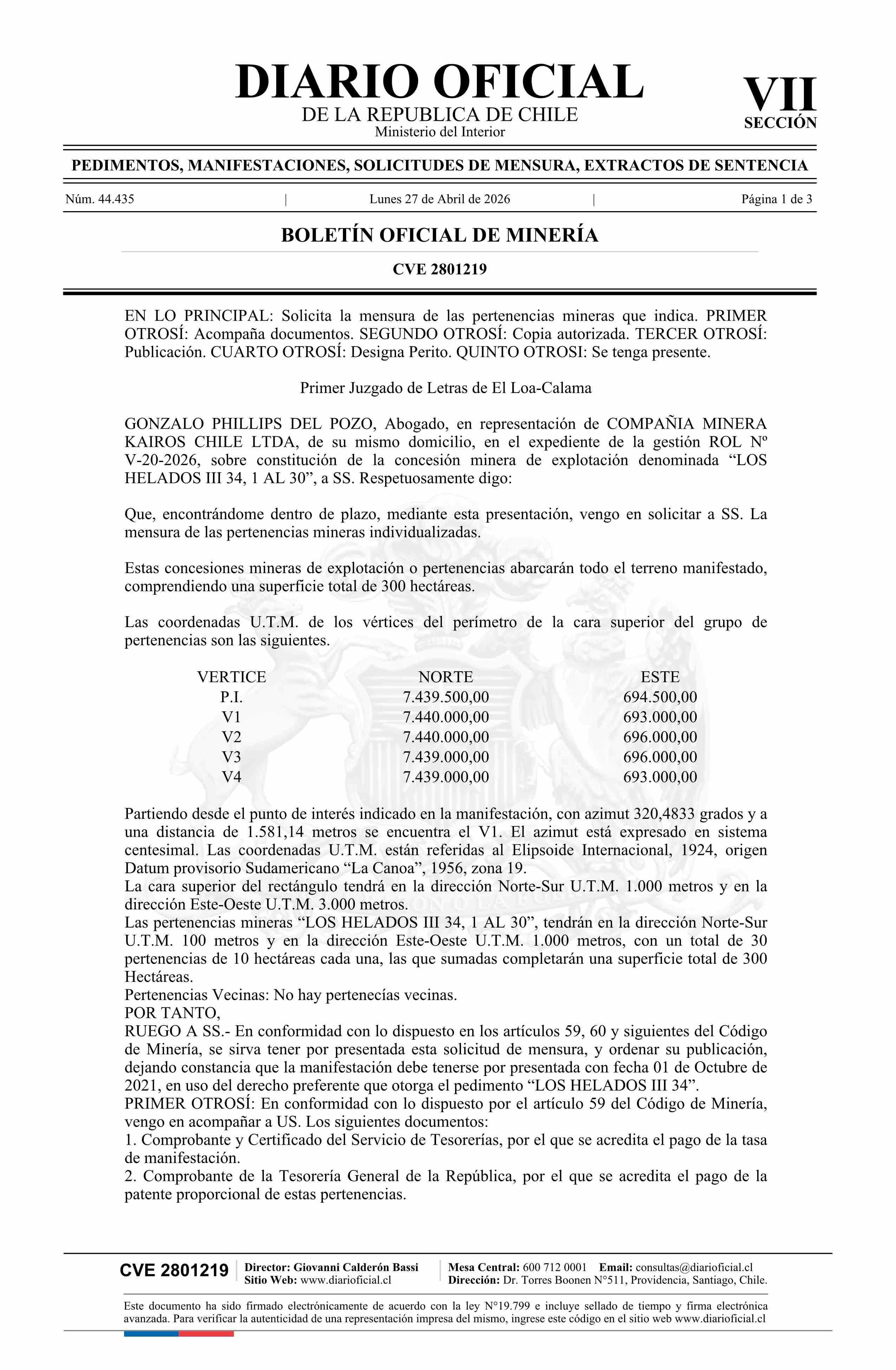 LOS HELADOS III 34, 1 AL 30 / Compañía Minera Kairos Chile Limitada 27-04-2026 DIARIO OFICIAL CHILE - BOLETÍN OFICIAL DE MINERÍA |