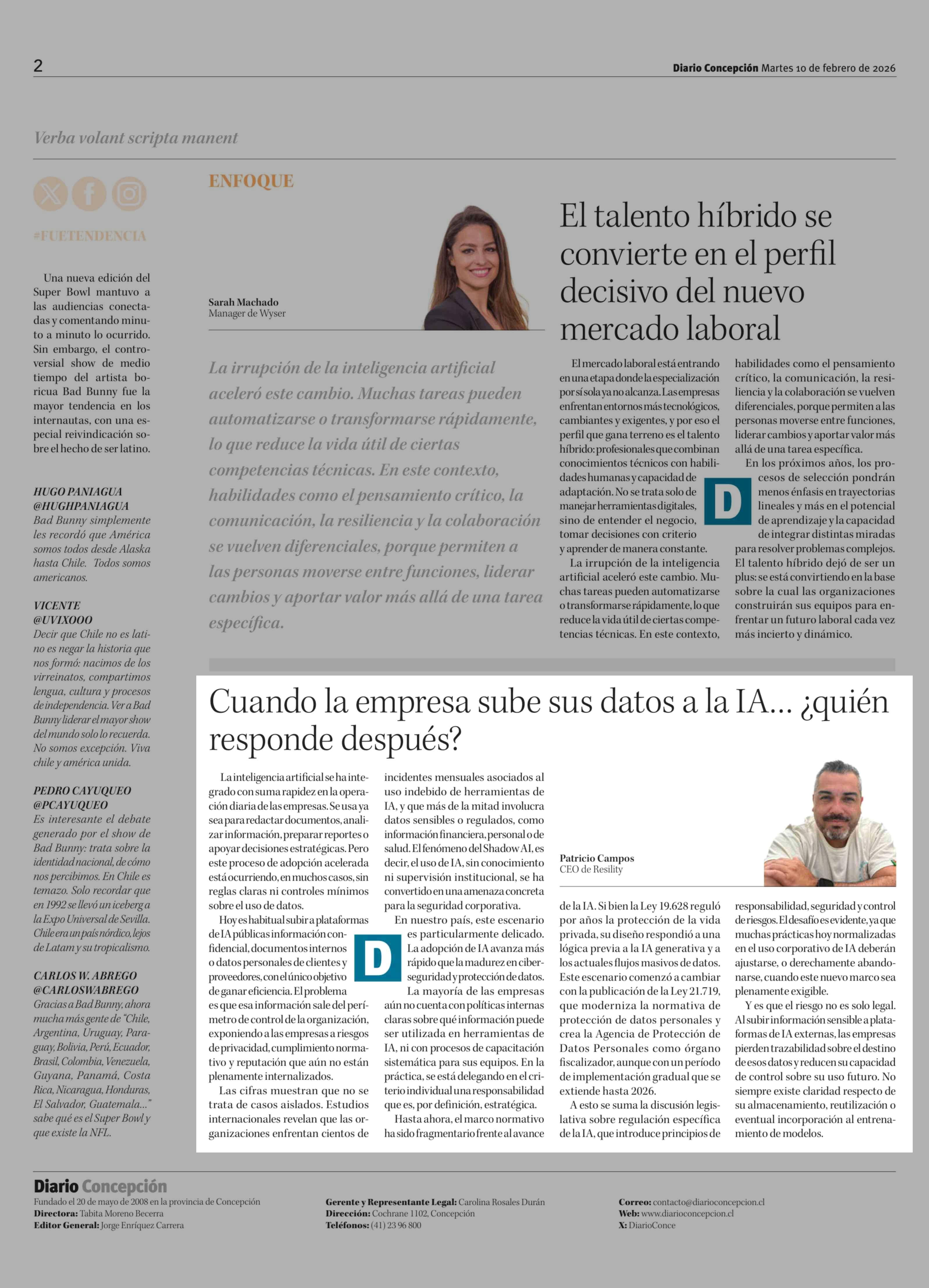 Columnas de Opinión: Cuando la empresa sube sus datos a la IA ... ¿ quién responde después? 10-02-2026 Diario Concepción |