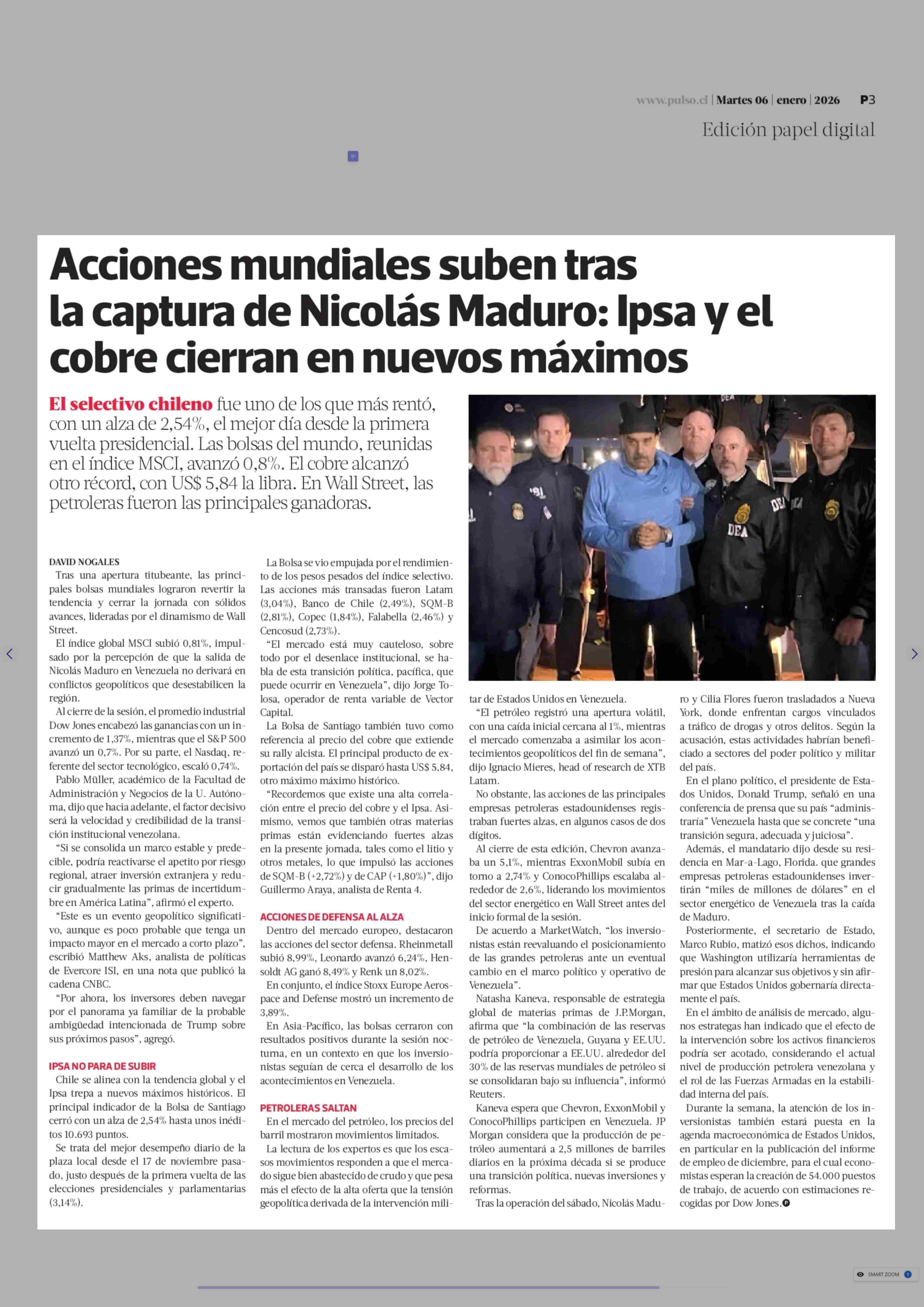 Título: Acciones mundiales suben tras la captura de Nicolás Maduro: Ipsa y el cobre cierran en nuevos máximos