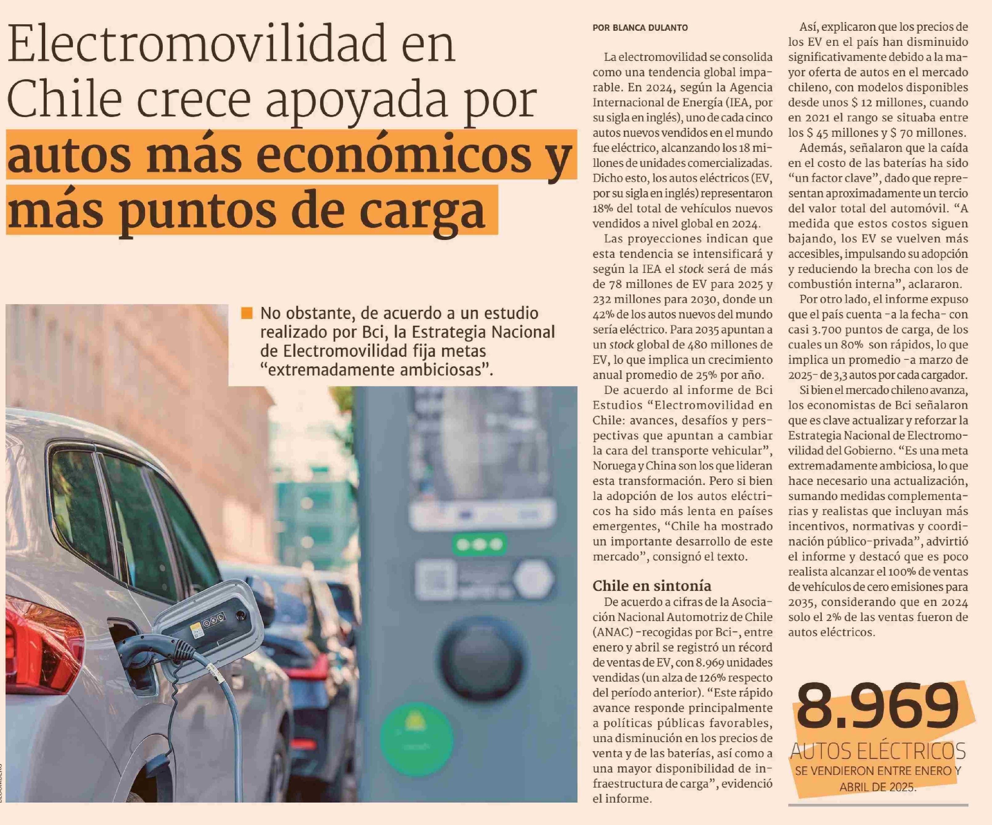 Electromovilidad en Chile crece apoyada por autos más económicos y más puntos de carga 27-05-2025 Diario Financiero |