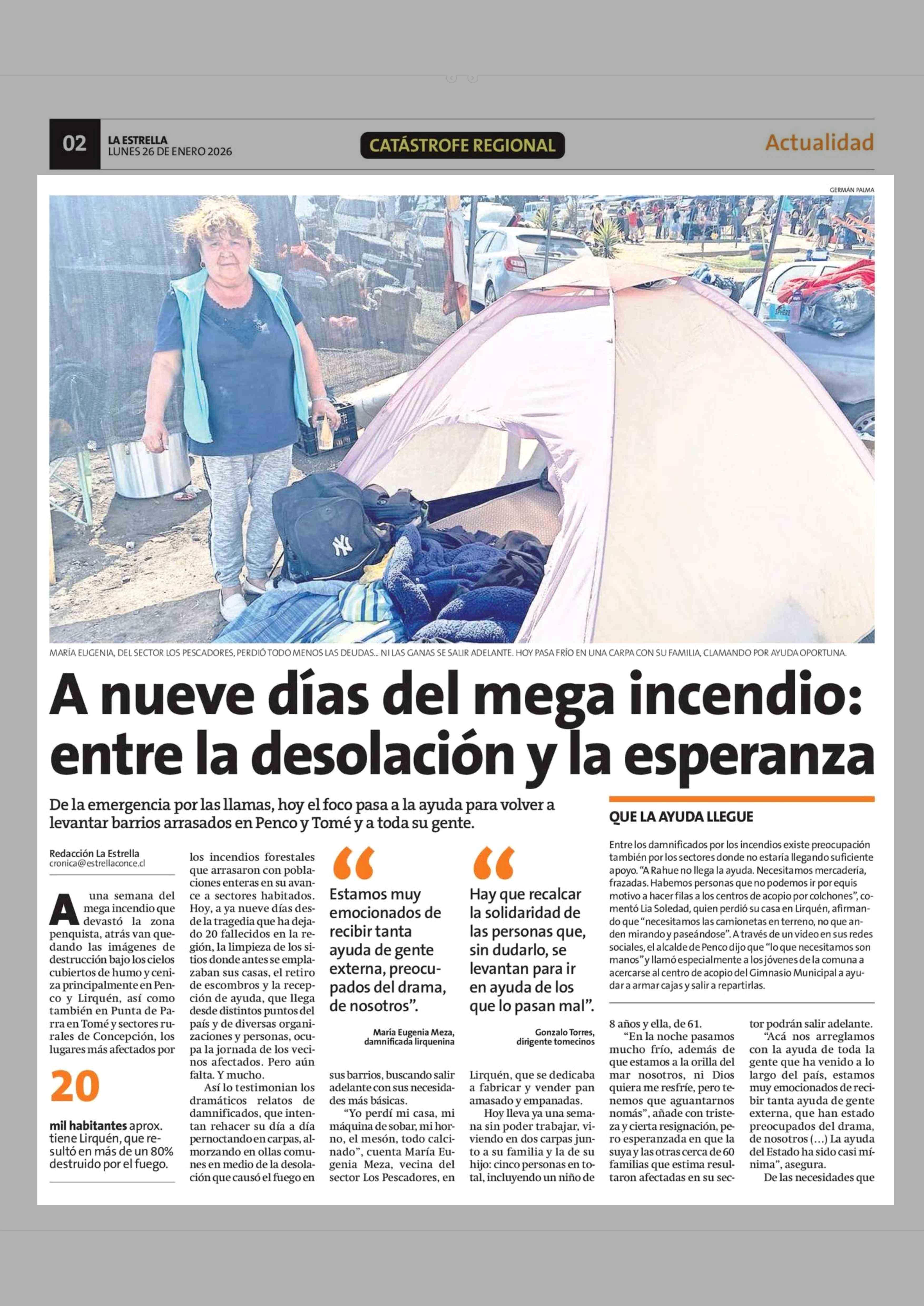 A nueve días del mega incendio: entre la desolación y la esperanza 26-01-2026 La Estrella de Concepción |